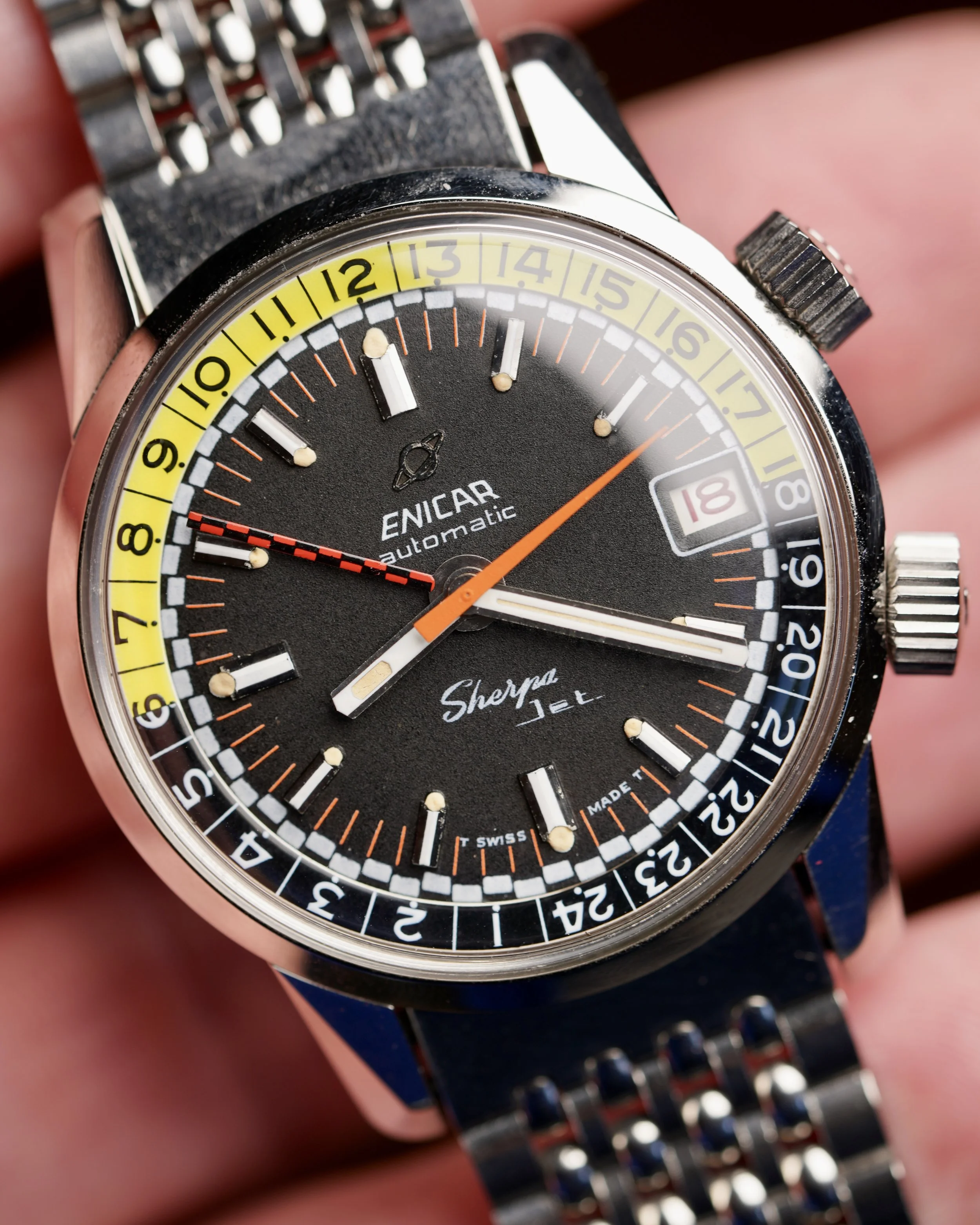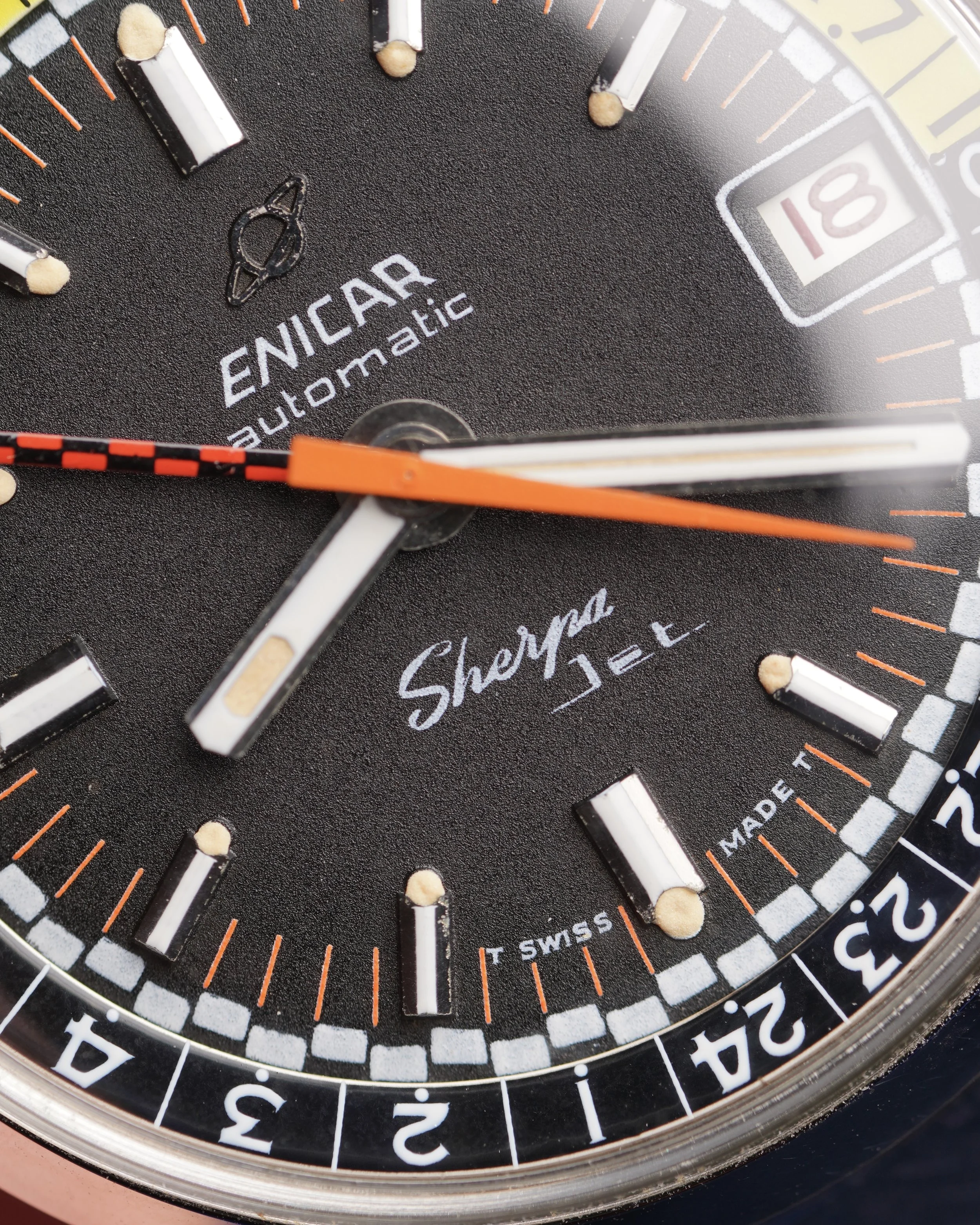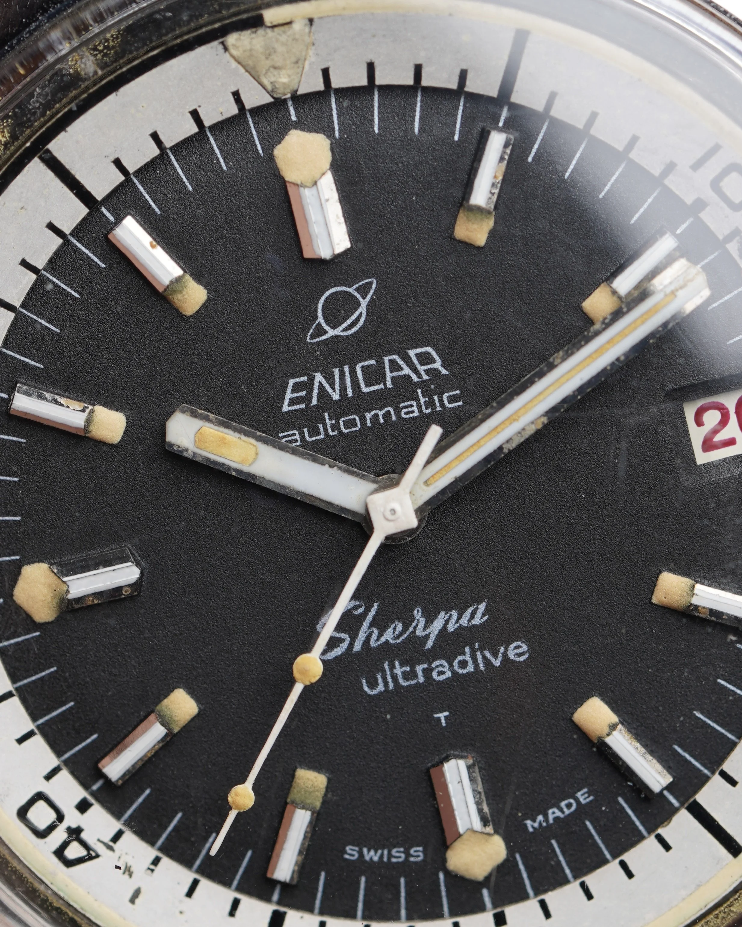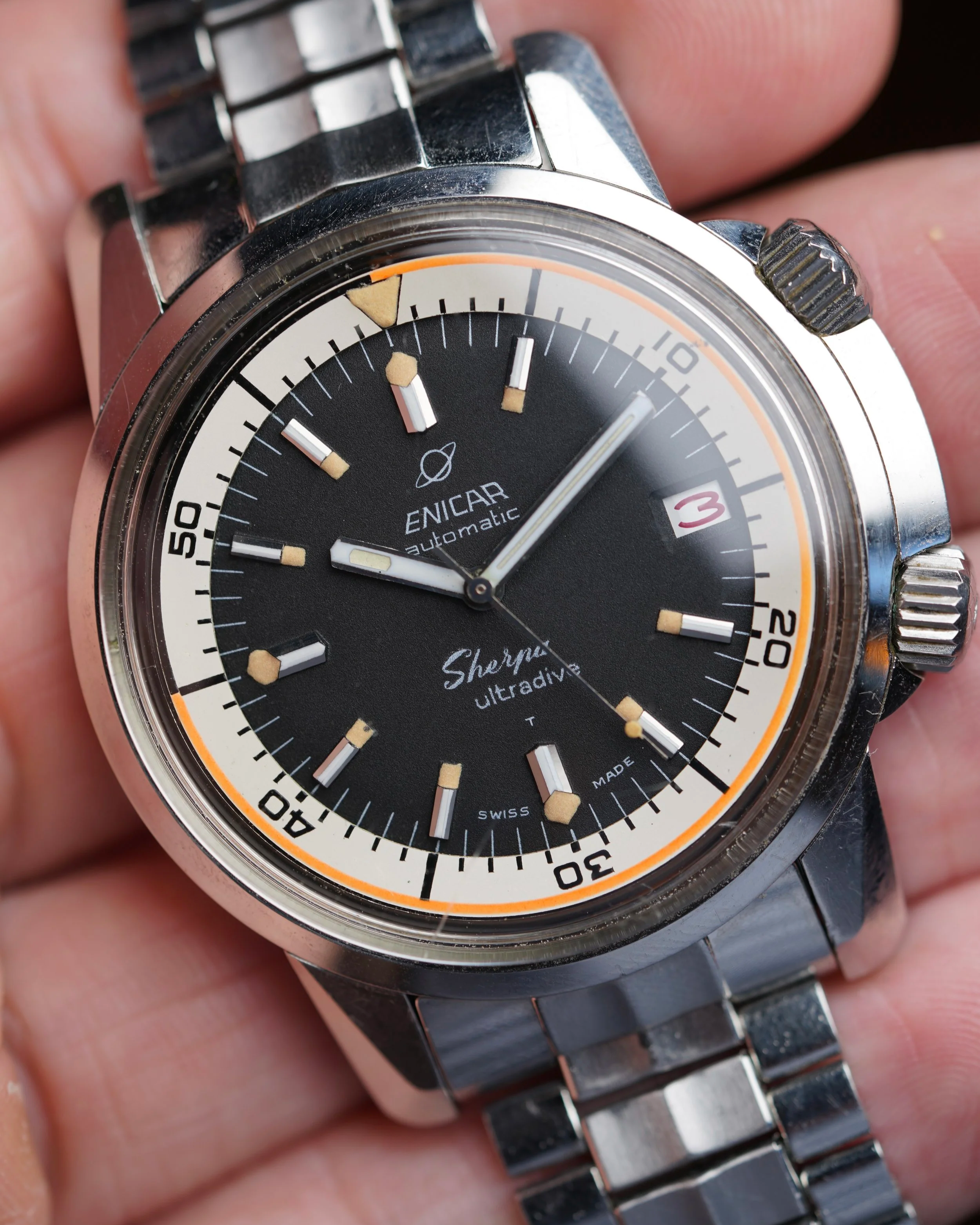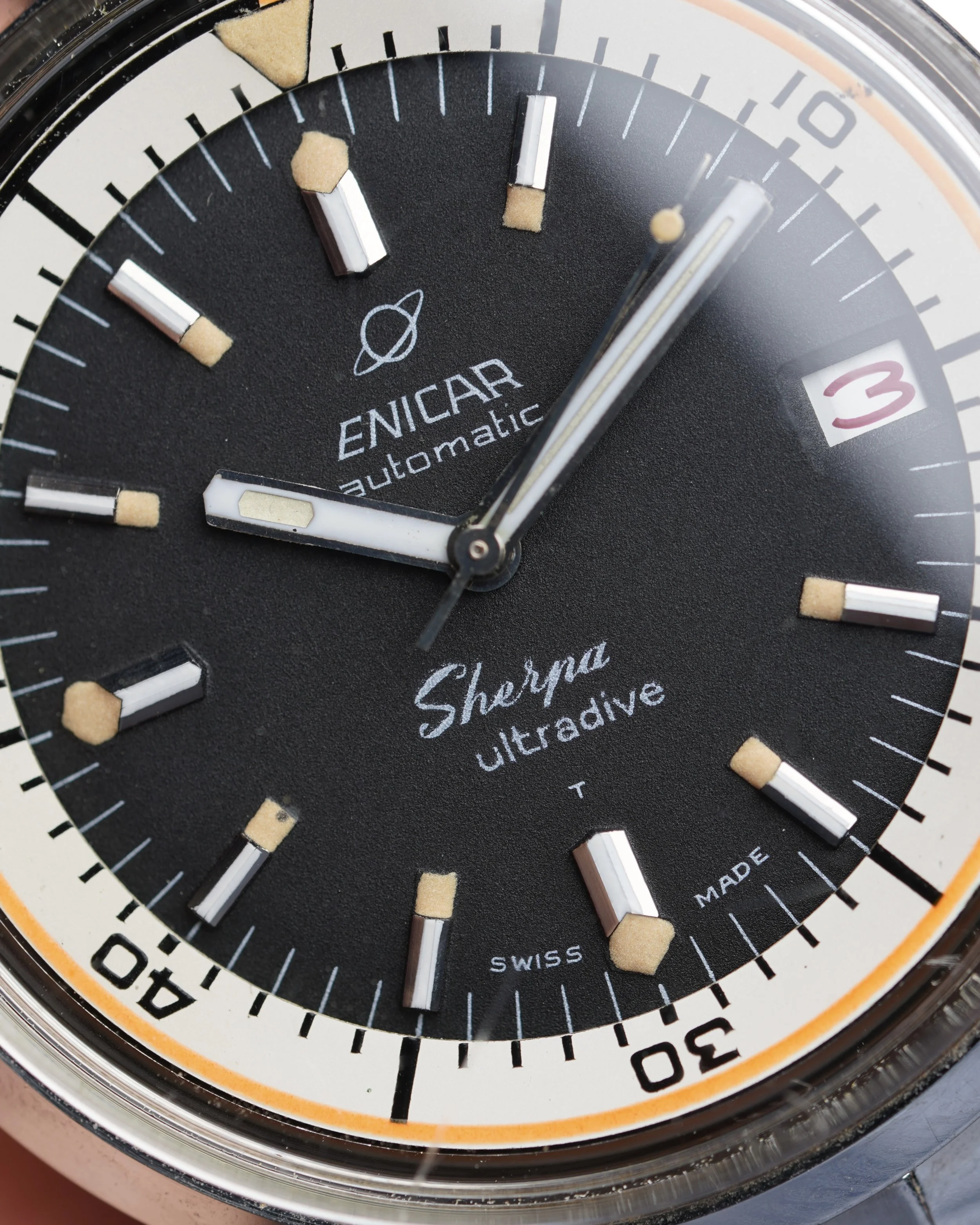 There are a number of iterations within Enicar Sherpa Ultradive making it quite fun to admire. The consistent attributes are the applied hour markers and that each model features the red calendar/date wheel. The tritium lume is applied in an interesting format (the interior or each hour marker with exception to 6, 9 and 12 o’clock. Most models feature the matte black dial - however there are rare silver soleil (sunburst) dials. Certain rotating bezels feature an orange or yellow track for the 45 minute zone, while others are non-luminous bezels void of either color. This accent is for determining the elapsed time while diving. There are orange triangle sweep second hands, as well as steel lollipop hands - and even double lollipop second hands (an earlier variant worn by Alain Delon). There are different handsets, the tilted Saturn logo is printed on earlier models then later applied logos, T (tritium) demarcations above 6 o’clock vs “T SWISS MADE T”. Whether this was an erratic experimentation or searching for the right details that landed with their clientele, it is clear that there were a lot of design cues Enicar were figuring out within the model.
