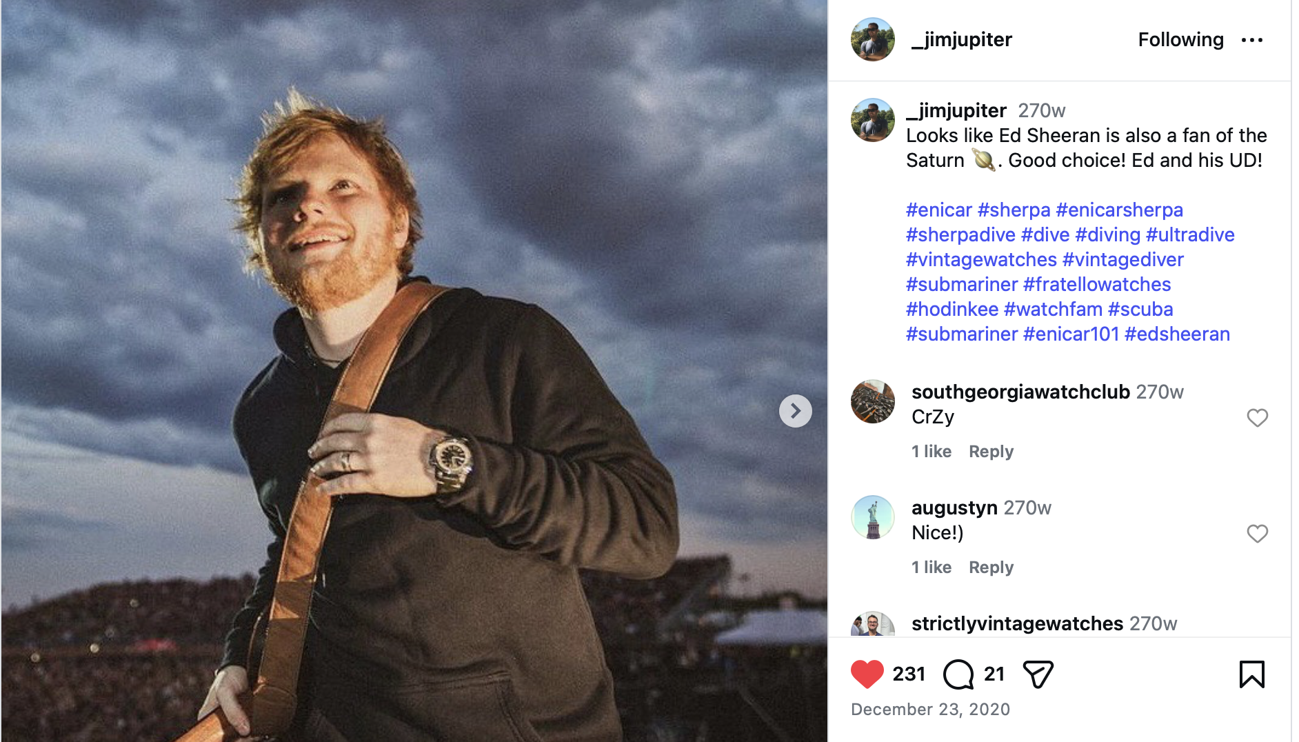 Another notable wearer of the Enicar Ultradive is Ed Sheeran who appears to have worn the reference 144/35/03 during his performance in Iceland at the Laugardalsvöllur stadium during 2019. He wore the humble Enicar Ultradive in between enjoying his Patek Philippe perpetual calendar chronograph reference 1518 on a bund strap (I believe the only time in human history where a bund has been paired with a 1518). An interesting fact behind the Sheeran Enicar is that it was originally in Eric Wind’s collection. Eric had given to a collector who later gave the watch to Sheeran.
