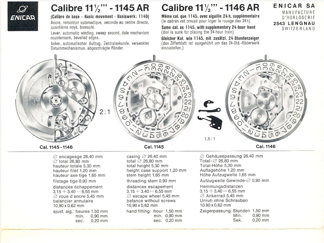 These watches are powered by the Enicar calibre 1145, an automatic calendar model. This movement is found in several Enicar models throughout the 1960s-1970s.