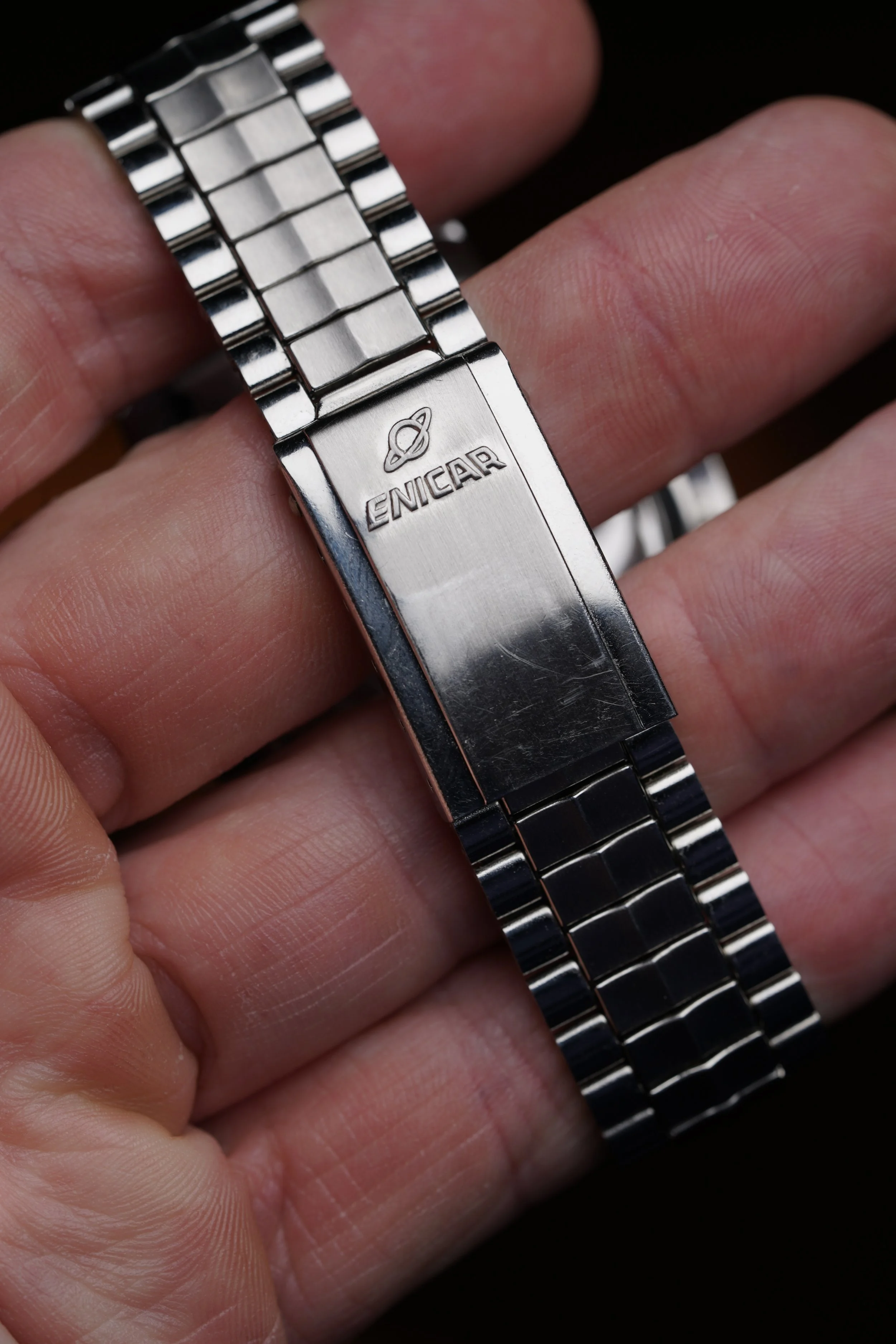 While most Ultradives are best suited on a large leather strap or Tropic strap, there are incredibly rare Enicar bracelets out there. Enicars do have some great beads-of-rice sports bracelets with 20mm end links. There are far more anonymous bracelets out there that are also compatible, so it may not be necessary to find a signed clasp. These were also sold on rivet bracelets that resemble the C&I bracelets made by Rolex (anonymously signed). The grail bracelet is the “snake” bracelet with the center links which somewhat resembles the “Lobster” bracelet design by Ponti Gennari for the Patek Philippe reference 2526. Good luck finding the bracelet, but in the event you do score one without end links, give the Rolex 280 end links a shot. Yes, I did replace an Enicar bracelet with a Rolex part. Thank me later.