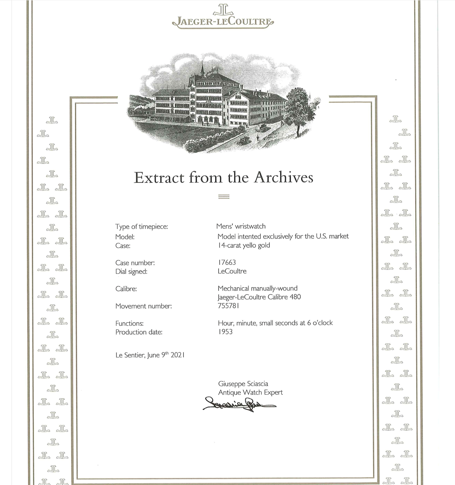 The Extract from the Archives mentions the “model [was] intended exclusively for the U.S. market” and that the production date is 1953. Presumably this is the date of the movement’s production and the casing would have likely occurred sometime after, or in the following years. No reference number is mentioned which is common for U.S. LeCoultre models and to the best of my research none exists. It is possible that one day a catalog or advertisement will surface lending insight to a “nickname” for the model or and additional context.
