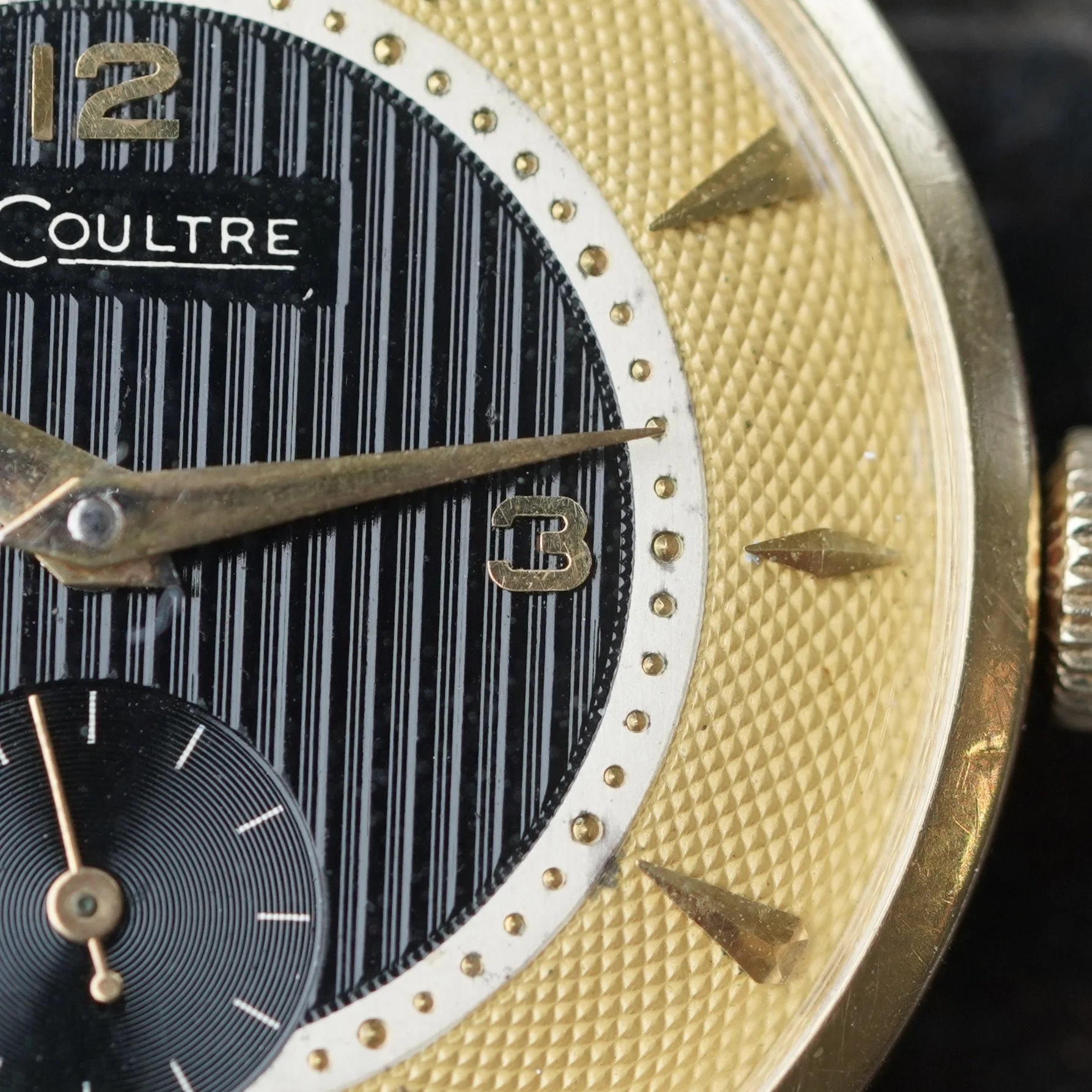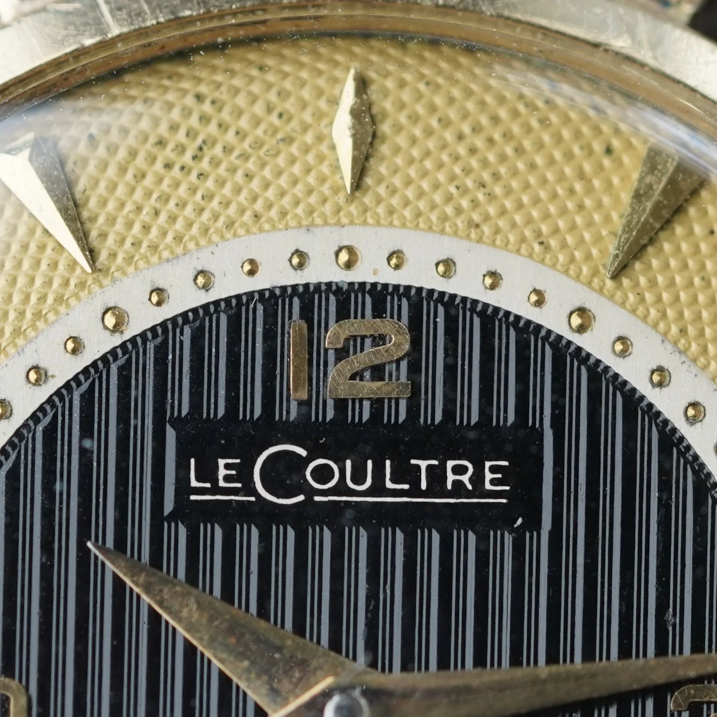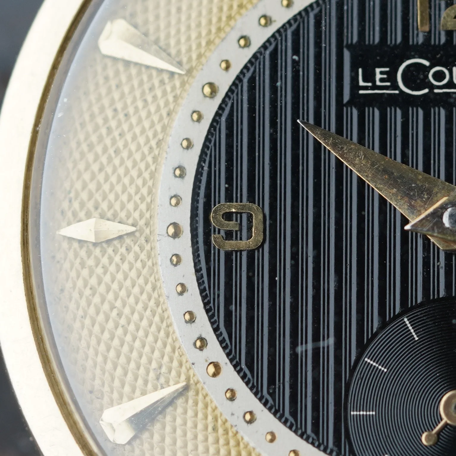 The dial the first thing that I am enamored by. It is made Fabrique de Cadran Stern Frères. The watch features an attractive numeral style found on models such as the Rolex Padellone, as well as various Patek Philippe and Movado models. The “LeCoultre” branding is displayed in a cartouche above vertical grooved layers from a straight lines of a hand engine-turned guilloche. The sixty minute markers are drilled into the white track. One of the very cool aspects to the watch is the gold colored barley guilloche, or grain d'orge on the exterior of the dial. The interior of the dial has a vertical guilloche in black.