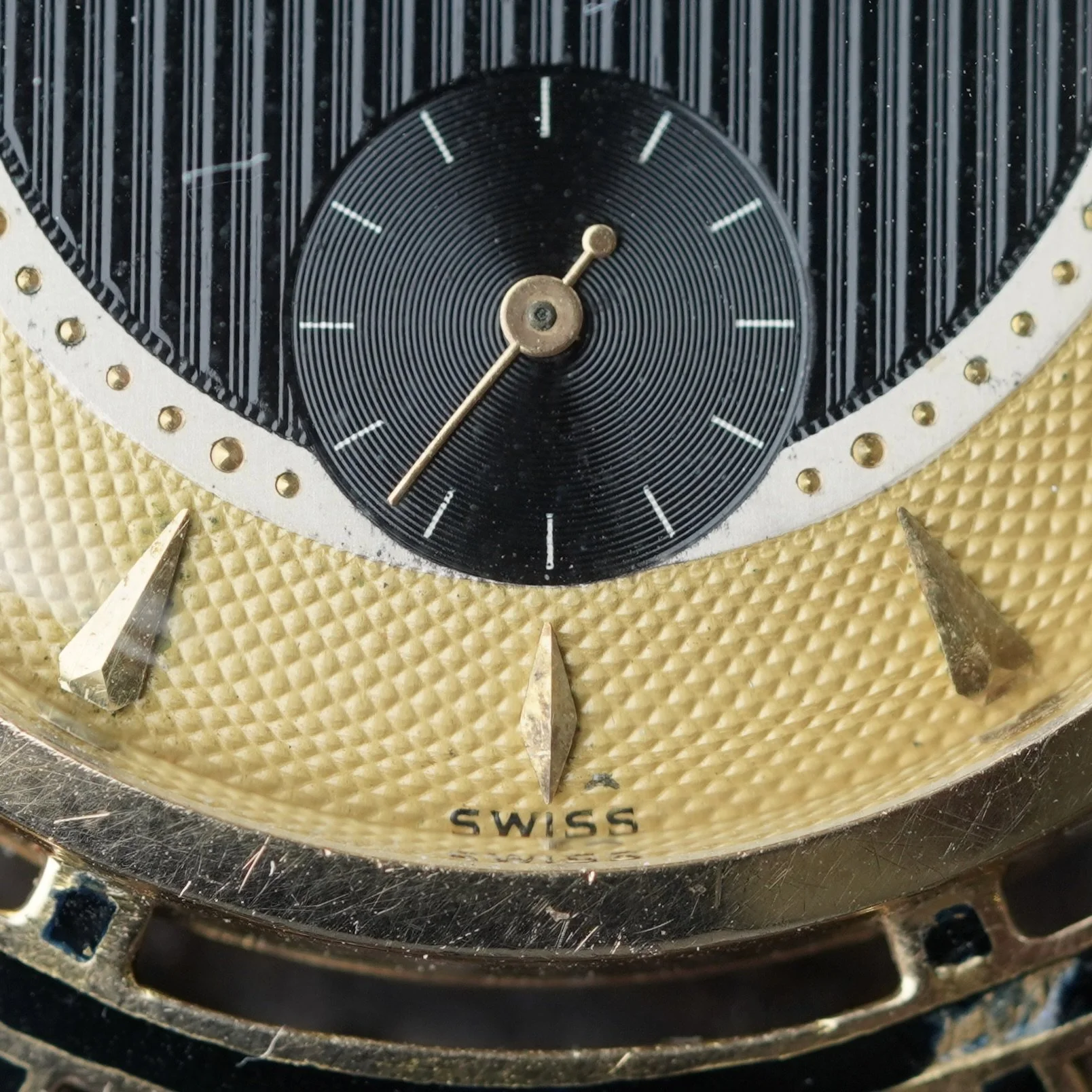The case is unusual snapback design with a round body measuring at 30.5mm in diameter. It features fancy lugs incorporating what appears to be an inlaid enamel or resin with the Ancient Greek meander design. Each lug protrudes outward from the case. With consideration to the lug-to-lug measurement, it will be 39mm at the most exterior section. The crown is unsigned. The case was produced by DiVincenzo & Arienti - a New York based case manufacturer that produced watches for the likes of LeCoultre, Hamilton, Longines and others. Their case designs are quite extravagant at times. You will notice the initials D&A on their cases.