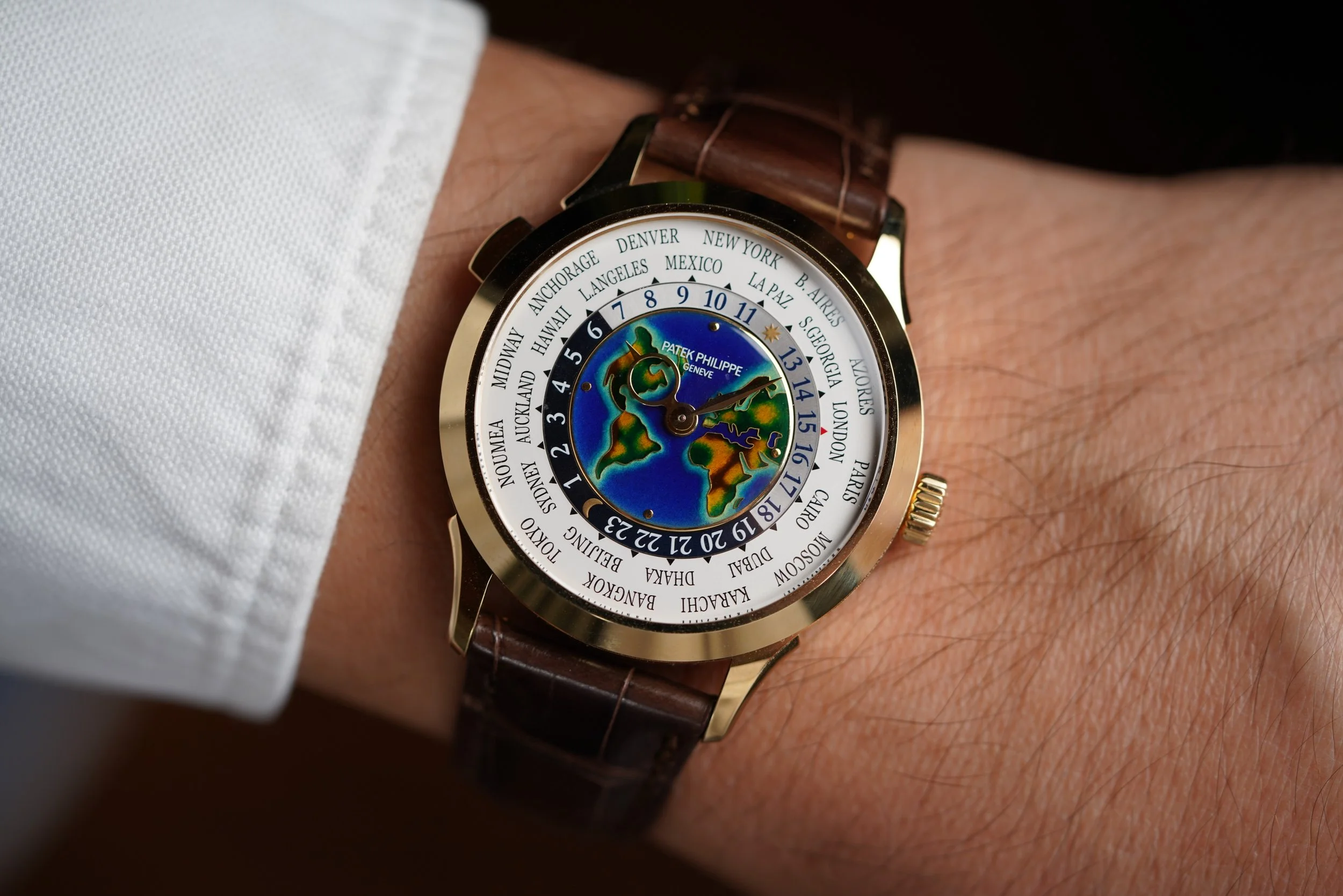 This Patek Philippe World Time reference 5231J-001 is an incredibly special timepiece. The dial is cloisonné Grand Feu enamel depicting the Americas, Europe, and Africa. The colors are tremendous in these dials and a beautiful scene each time you look at the time. The watch is powered by the calibre 240 HU - an ultra-thin self-winding movement with a 24-hour disc to set the time for any major city you travel to. The 18k yellow gold case is in like new condition and has only been worn a few times over the years. It features the classic World Time hour hand. The watch debuted in 2019 and is one of the most sophisticated Patek Philippe world time models. It measures 38.5mm in diameter, 47mm lug-to-lug and 10.25mm thick.