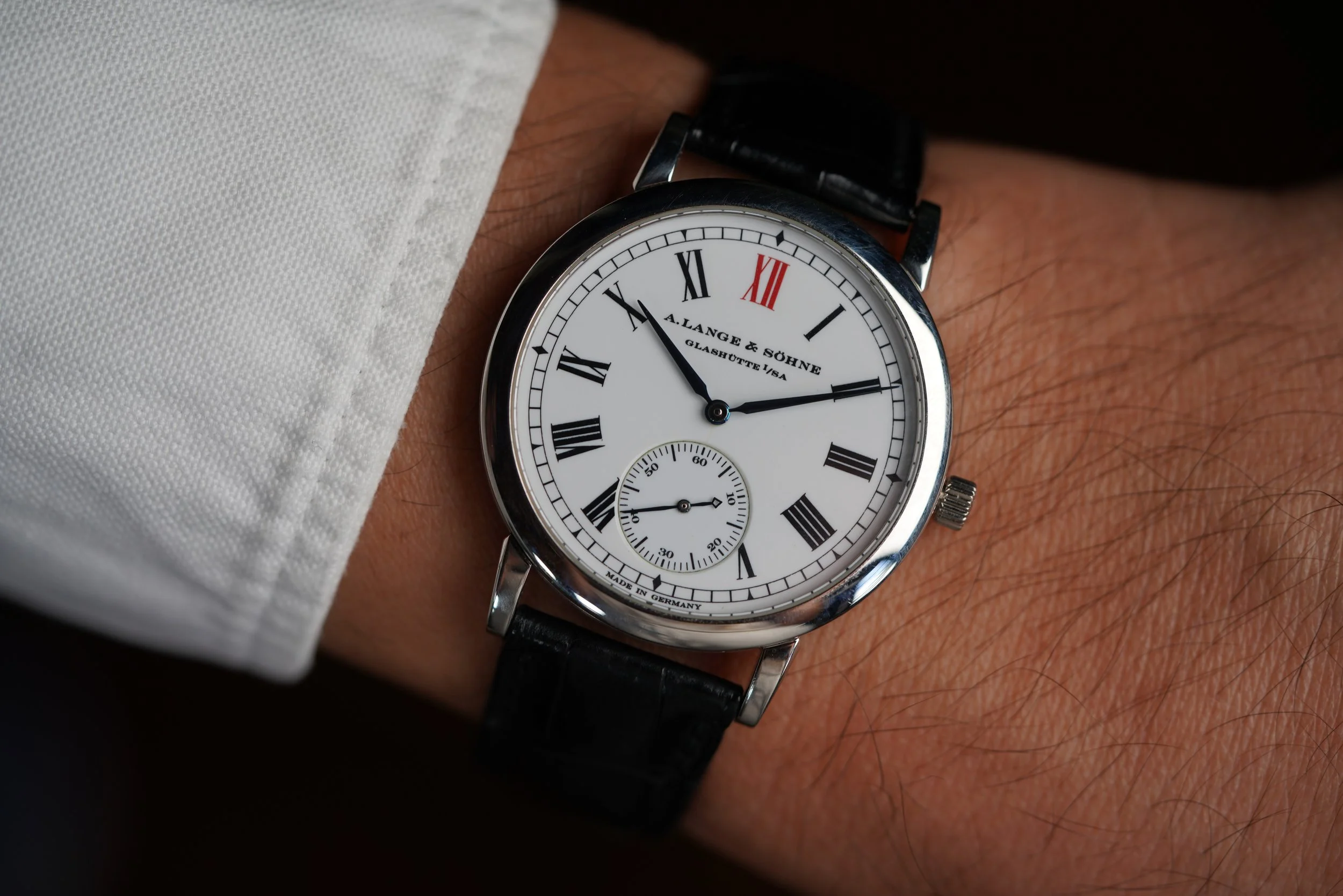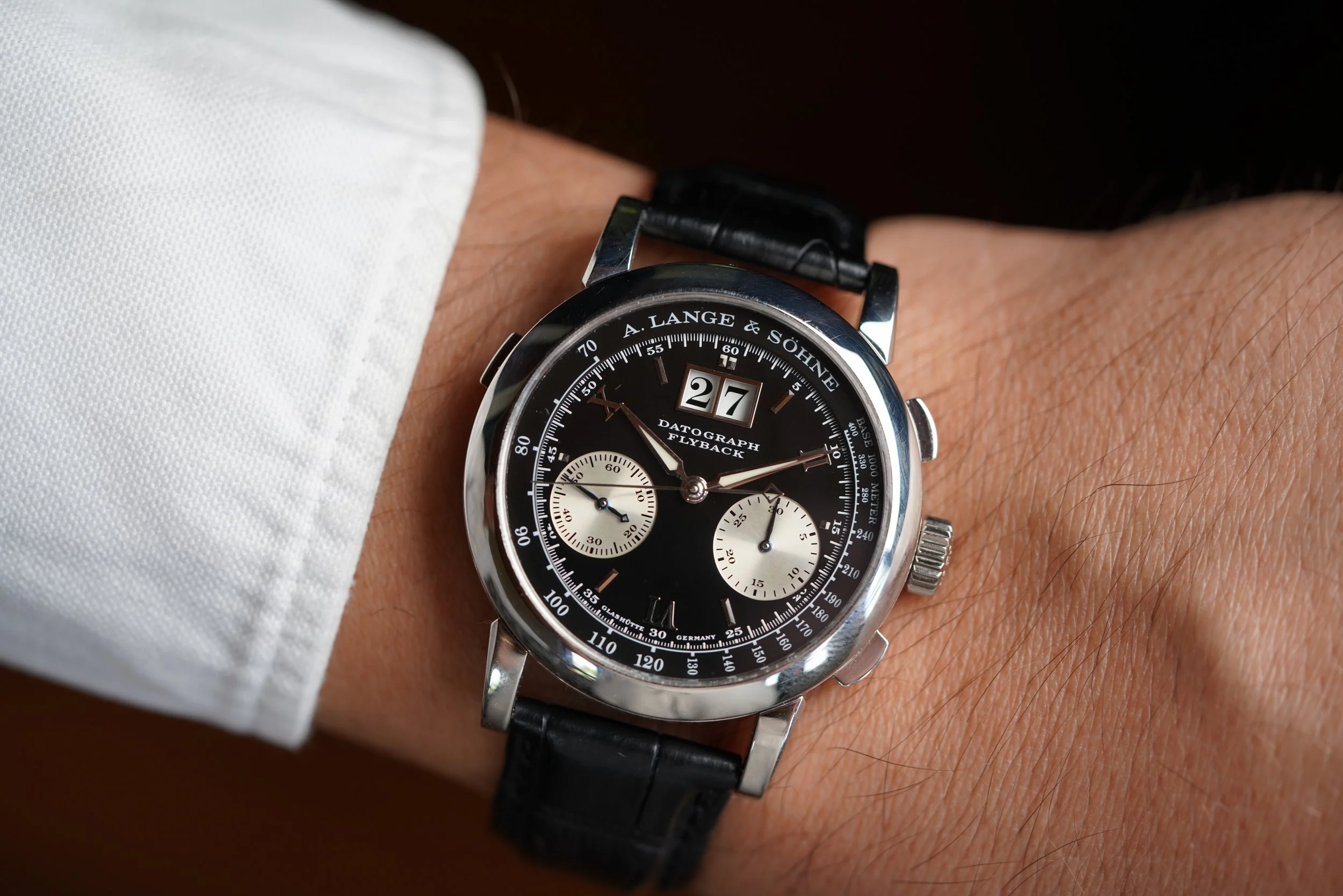 This A. Lange & Söhne Datograph Reference 403.035 is one of the most exceptional chronograph watches ever produced and is an icon from the German manufacturer. This is an early example with a “Meter dial”. The dial reads “Base 1000 Meter" by three o’clock, whereas later examples say “Meters” instead of “Meter”. The case is made of platinum. It appears to be lightly polished. It measures 39mm in diameter, approximately 47.5mm lug-to-lug.