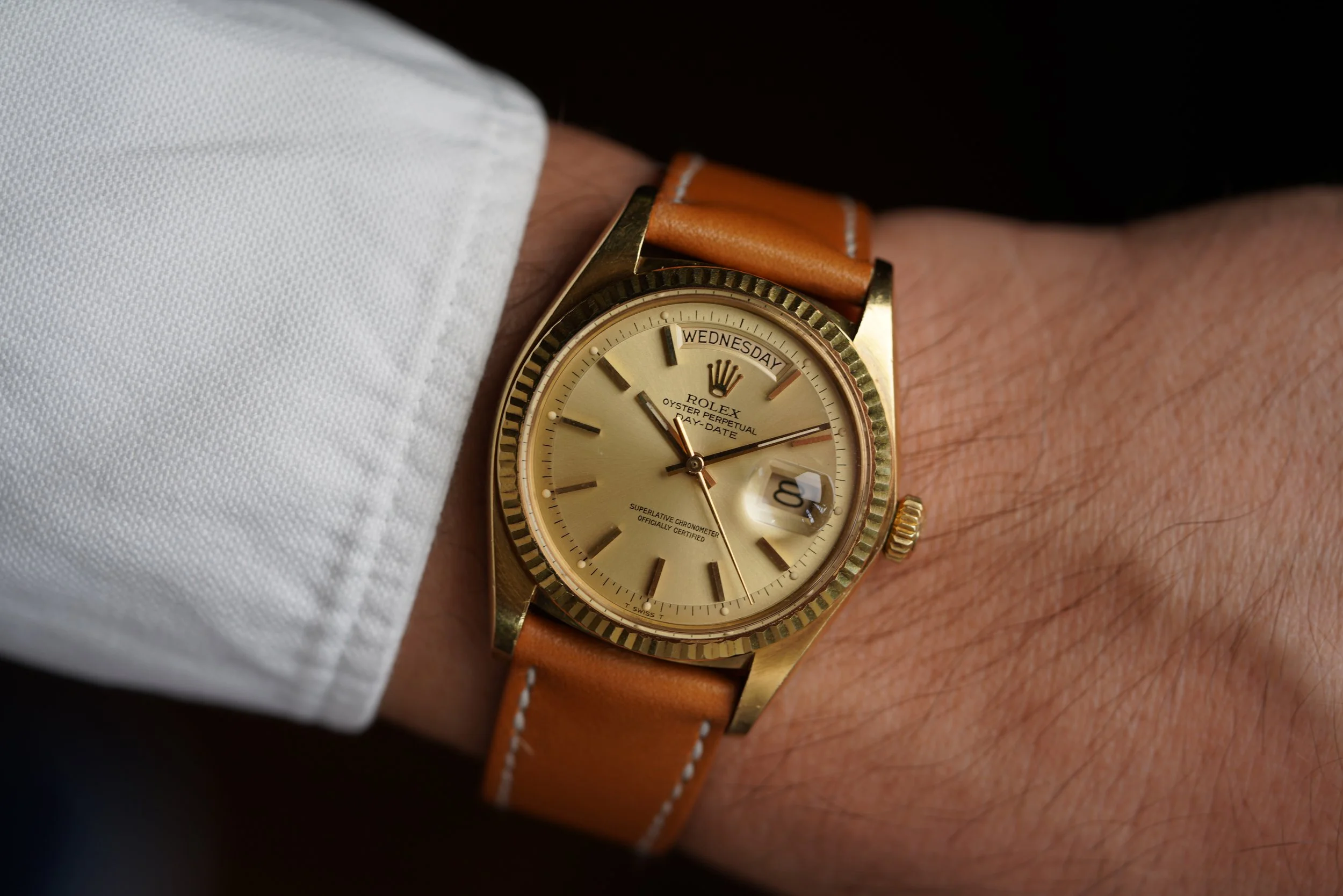 This Rolex Day-Date reference 1803 is an outstanding example. The 18K yellow gold case appears to be unpolished. It measures 36mm in diameter. It features a 4.01M serial dating to 1975. The champagne dial is incredibly attractive. It is paired on a beautiful tan leather strap.