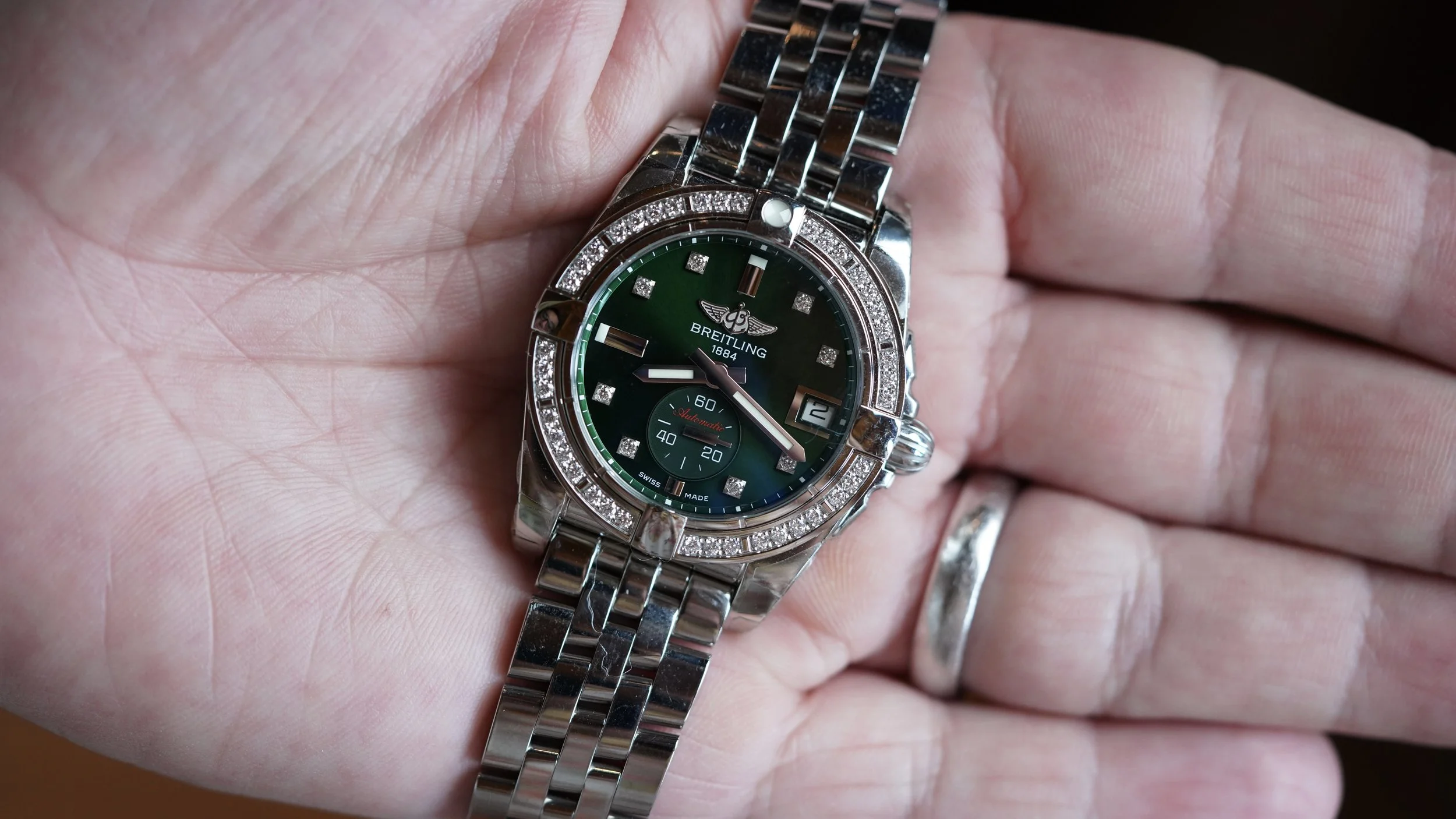 This stainless steel Breitling Galactic 36 chronograph is an awesome watch in stainless steel. The case measures approximately 36mm in diameter. It features a green dial. The bracelet is extremely comfortable. It features a beautiful diamond set bezel.