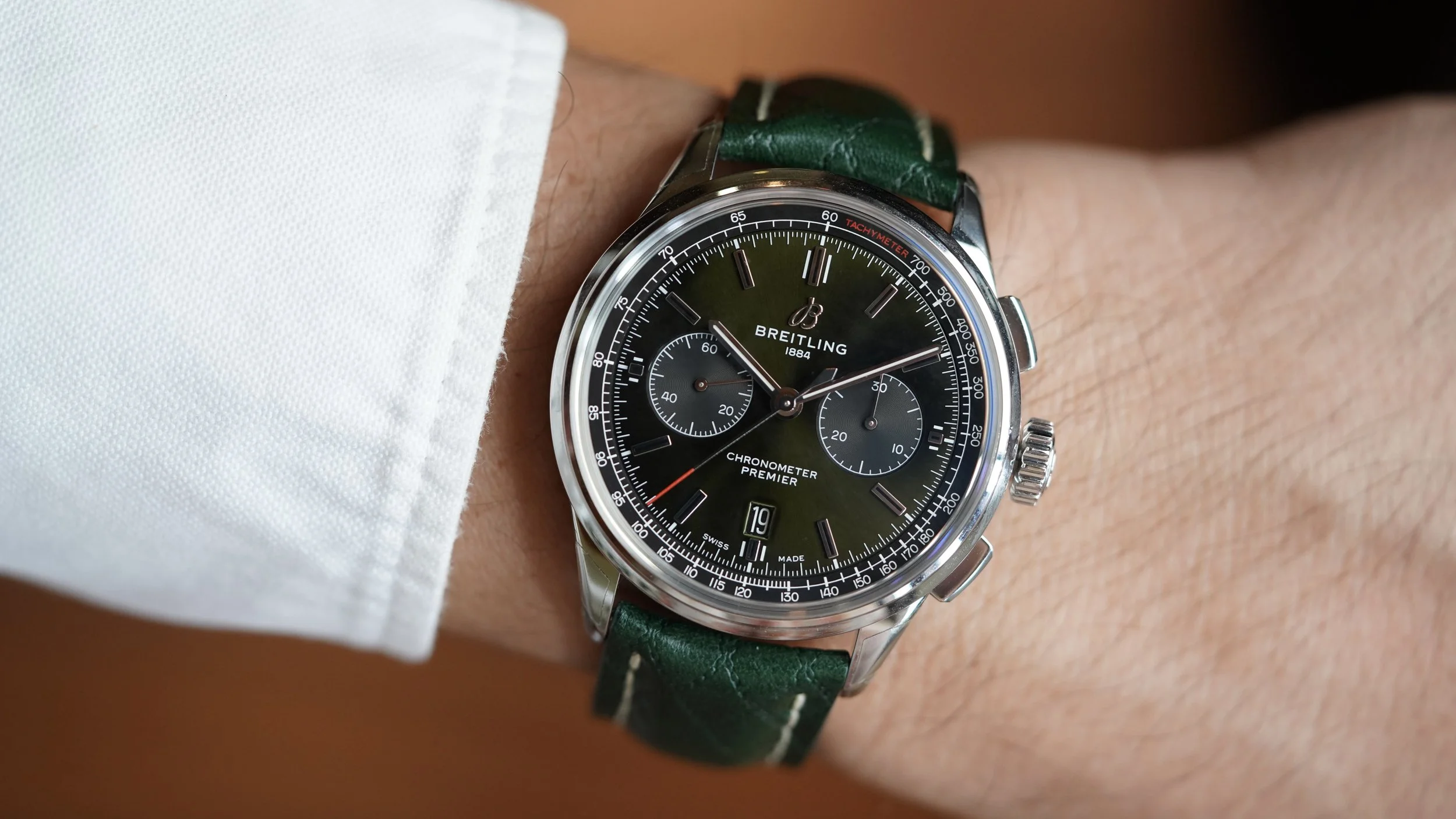This stainless steel Breitling chronograph reference AB01185A1L1X1 is a great chronograph made in stainless steel. The case measures approximately 42mm in diameter. It features a green dial and green leather strap.