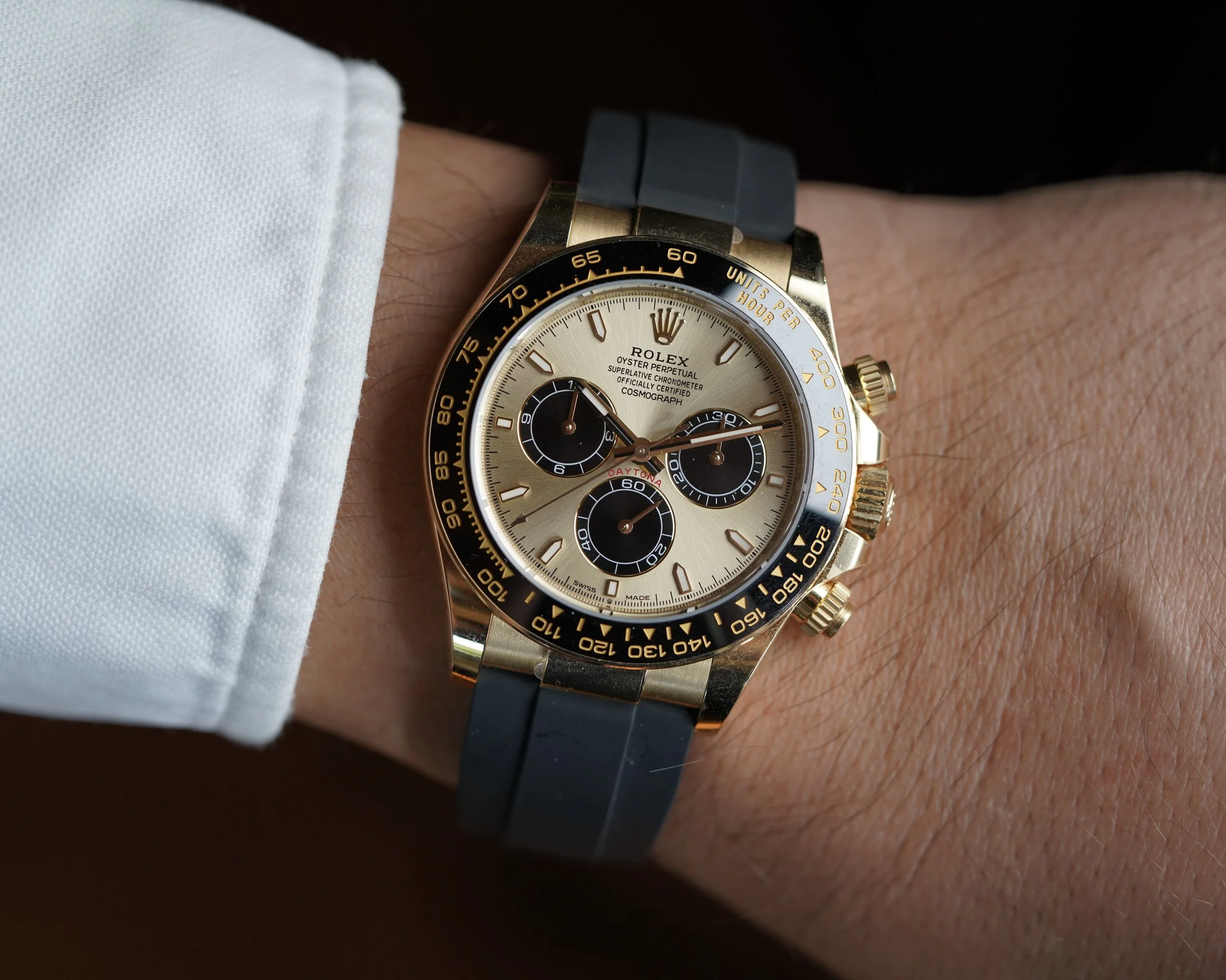 This Rolex Daytona is a great modern example in 18k yellow gold the Oysterflex rubber bracelet. It features the attractive champagne dial with black sub dials. The watch is in great condition, we believe it to be unpolished, and the clasp is partially stickered. We believe the case is unpolished. The Oysterflex bracelet features an F size strap at 12 o’clock and a D size strap at 6 o’clock. We do not know the service history, but the watch is running well. It does not come with a box or papers.