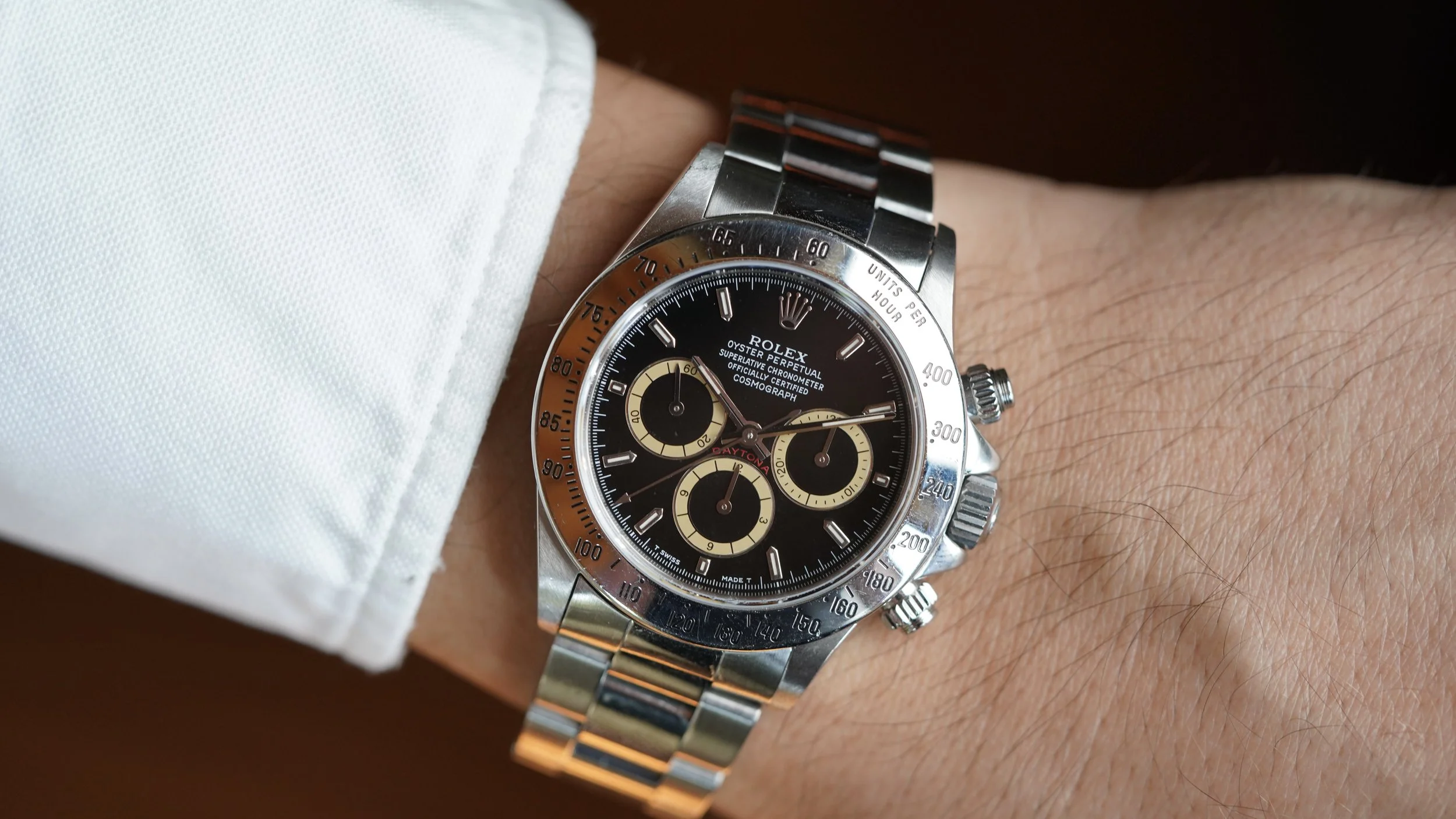 The adorned “Zenith Daytonas” are certainly among the highly desired neo-vintage Rolex models. Zenthi Daytonas were produced from circa 1988 until 2000. It is powered by an automatic Calibre 4030 made by Zenith. It measures 40mm in diameter (42.5 including crown) and 47mm lug to lug. The outer ring of the registers have developed a very attractive beige color. Rolex register rings on Daytonas with black dials from the early through middle 1990s would often develop some darkening to the rings. This effect is often given the nickname “Patrizzi” after the legendary auctioneer Osvaldo Patrizzi, who reportedly first identified this patina.