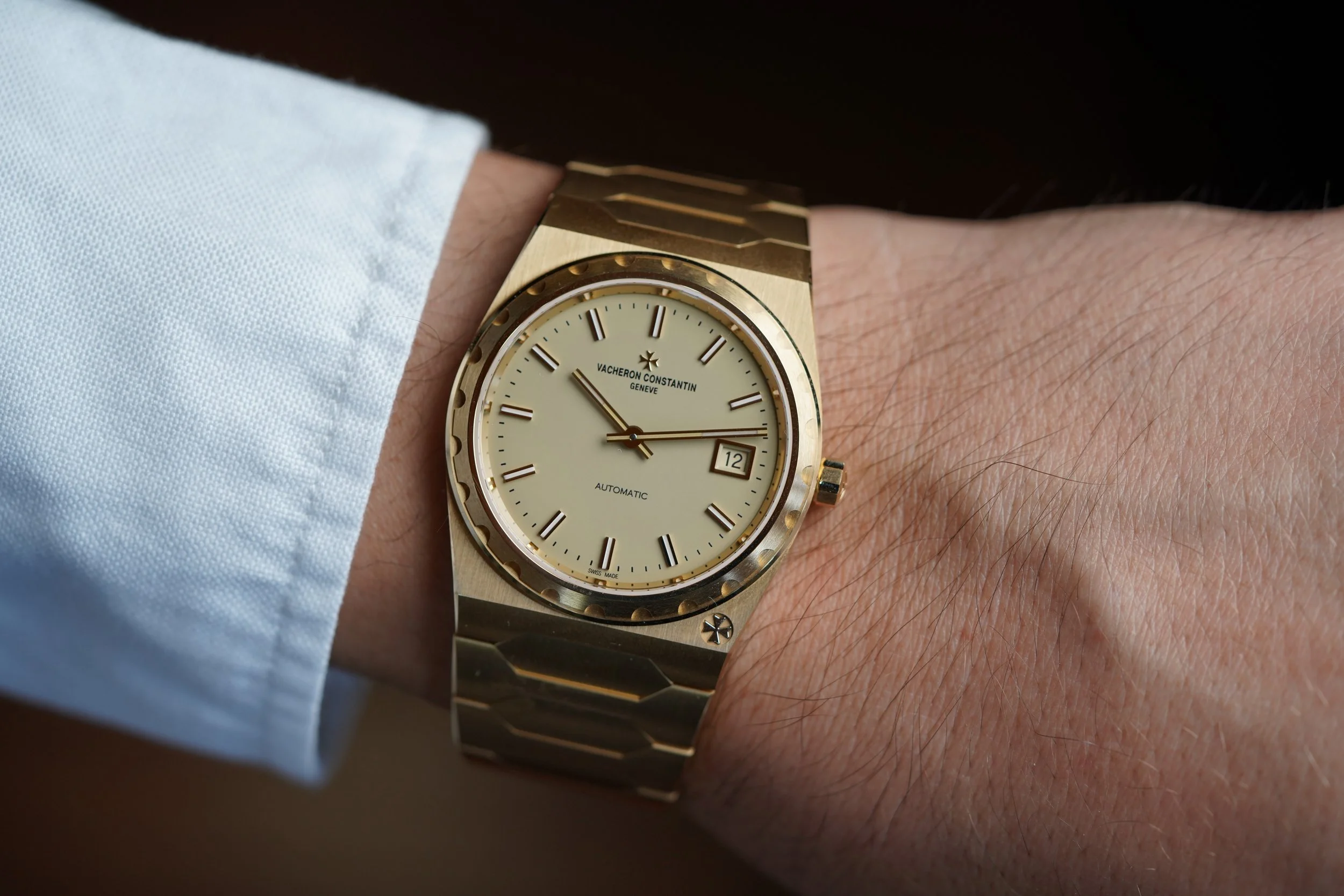 This Vacheron Constantin Historiques 222 is a highly sought after modern dress watch in 18k yellow gold. The watch, which features an integrated gold bracelet measures 37mm in diameter and just under 8mm in thickness. It comes with an exhibition caseback, displaying the self winding 2455/2 movement. The watch is in excellent condition and appears to be unpolished.