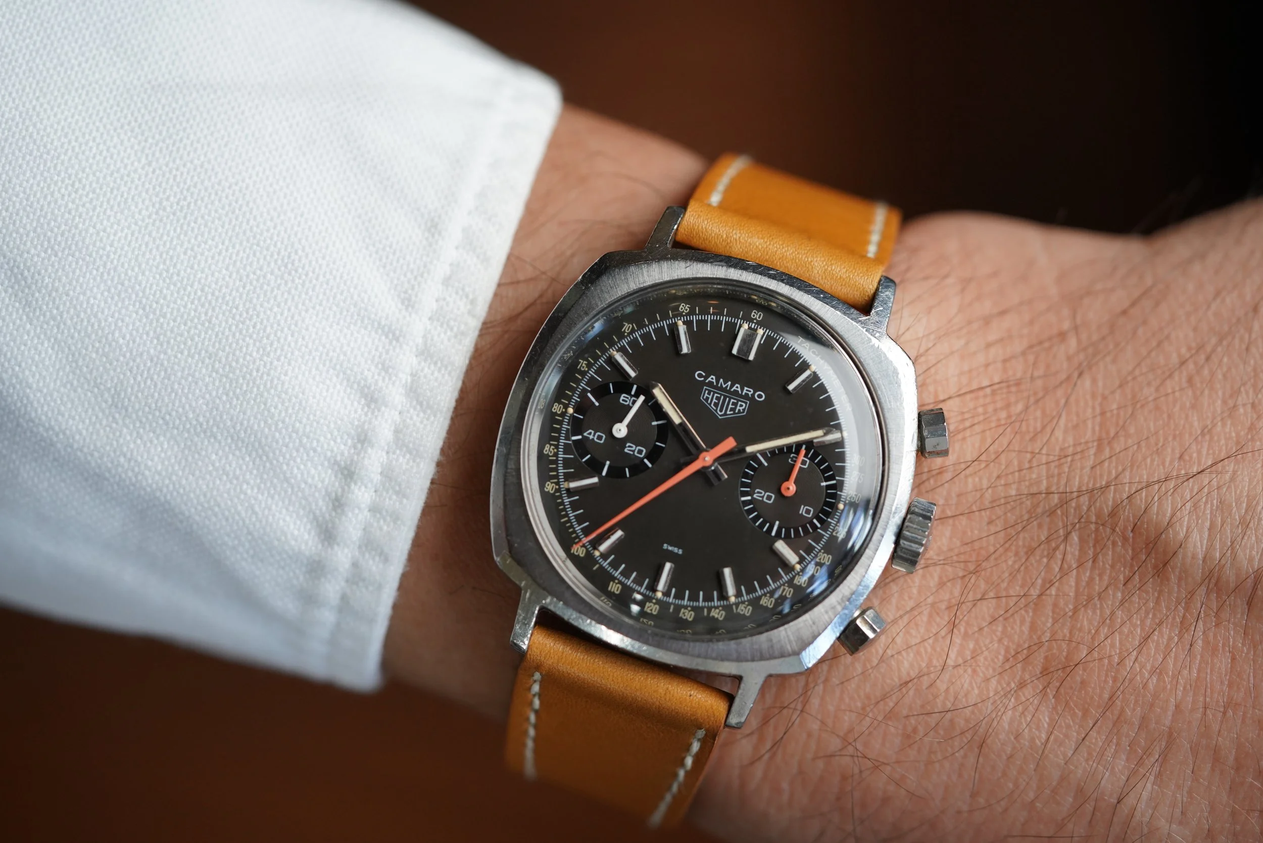 Heuer is renowned for its rich history with automotive racing, and one of the great models from the golden age of the brand is the Camaro. The Camaro line has always been a sleeper when compared to the more discussed siblings such as the Autavia and Carrera. This particular reference 7743 NT has an awesome dark brown “exotic racing” dial. The radial finished bezel is always a highlight within unpolished exampled such as this. The watch is powered by the Valjoux 7730, a formidable bi-register chronograph that has stood the test of time. It is paired on an aftermarket strap and buckle.