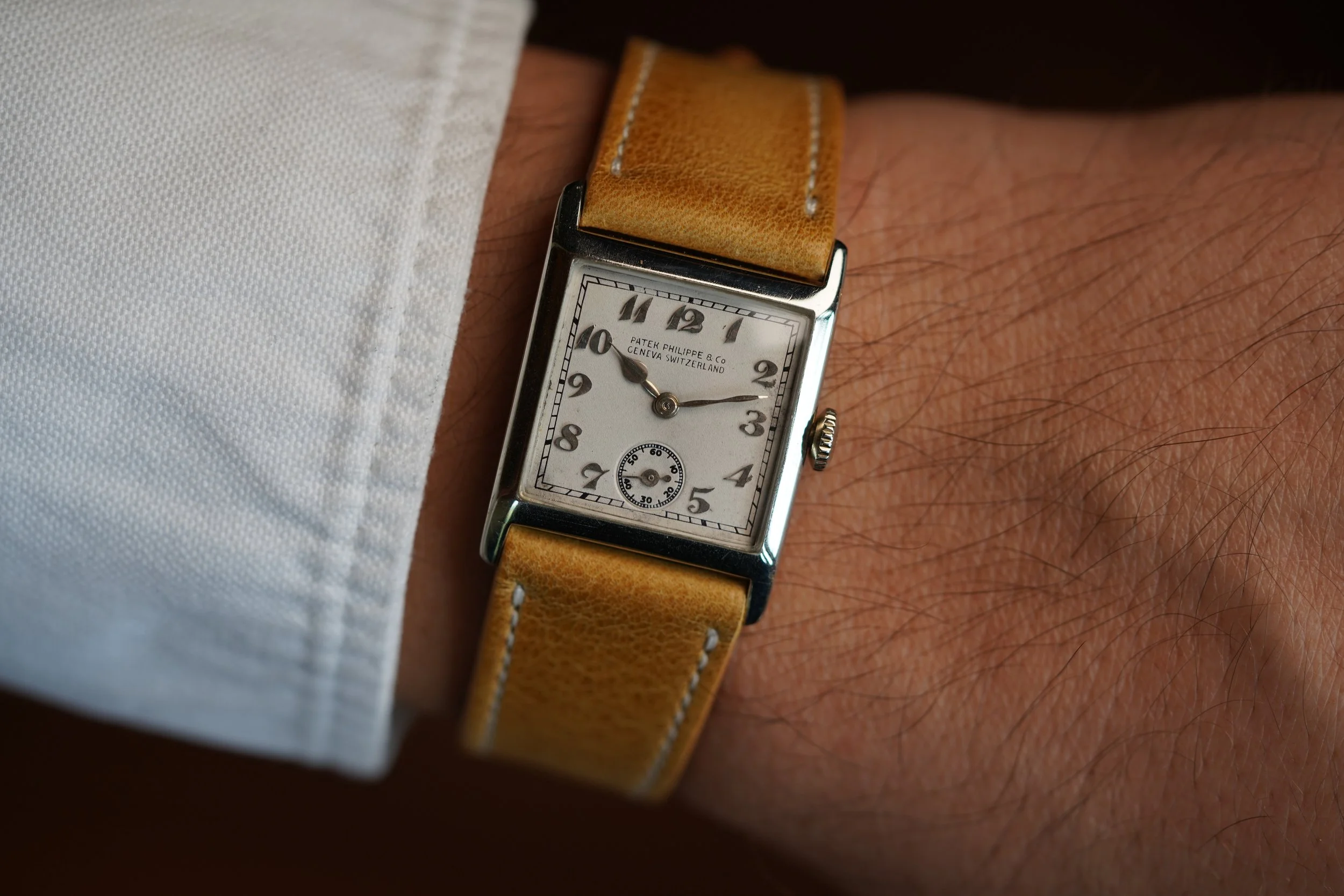 This is an incredible Patek Philippe white gold Tank style watch dating to 1926. The watch features applied Breguet numerals which is rare and particularly attractive. This example features a white gold case measuring 24mm in diameter by 32mm in length. The dial is a square shaped. The dial has been cleaned in the past, which is the case with 99% of these timepieces. The crown is original and one of the extremely interesting crowns found in early Patek Philippe wristwatches. For those fascinated by vintage Tank style watches, this is an unusual and stylish option from the leading name in watchmaking.