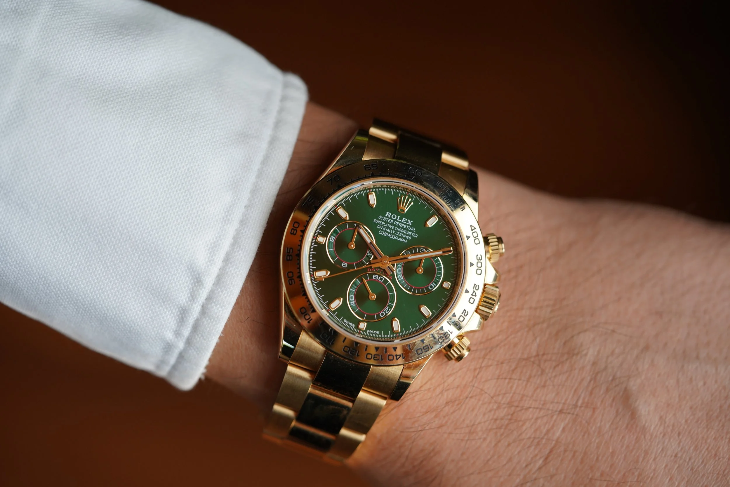 Nicknamed for the 2nd appearance on HODINKEE Talking Watches, this Rolex Daytona reference 116508 with green anniversary dial would take on the rockstar nickname "John Mayer". Despite being a departure from the Daytona’s utility-based nature, this model has become admired amongst a range of Rolex collectors and has been spotted on many other notable wrists including Jonah Hill’s. The case measures 40mm in diameter. The watch is unpolished.