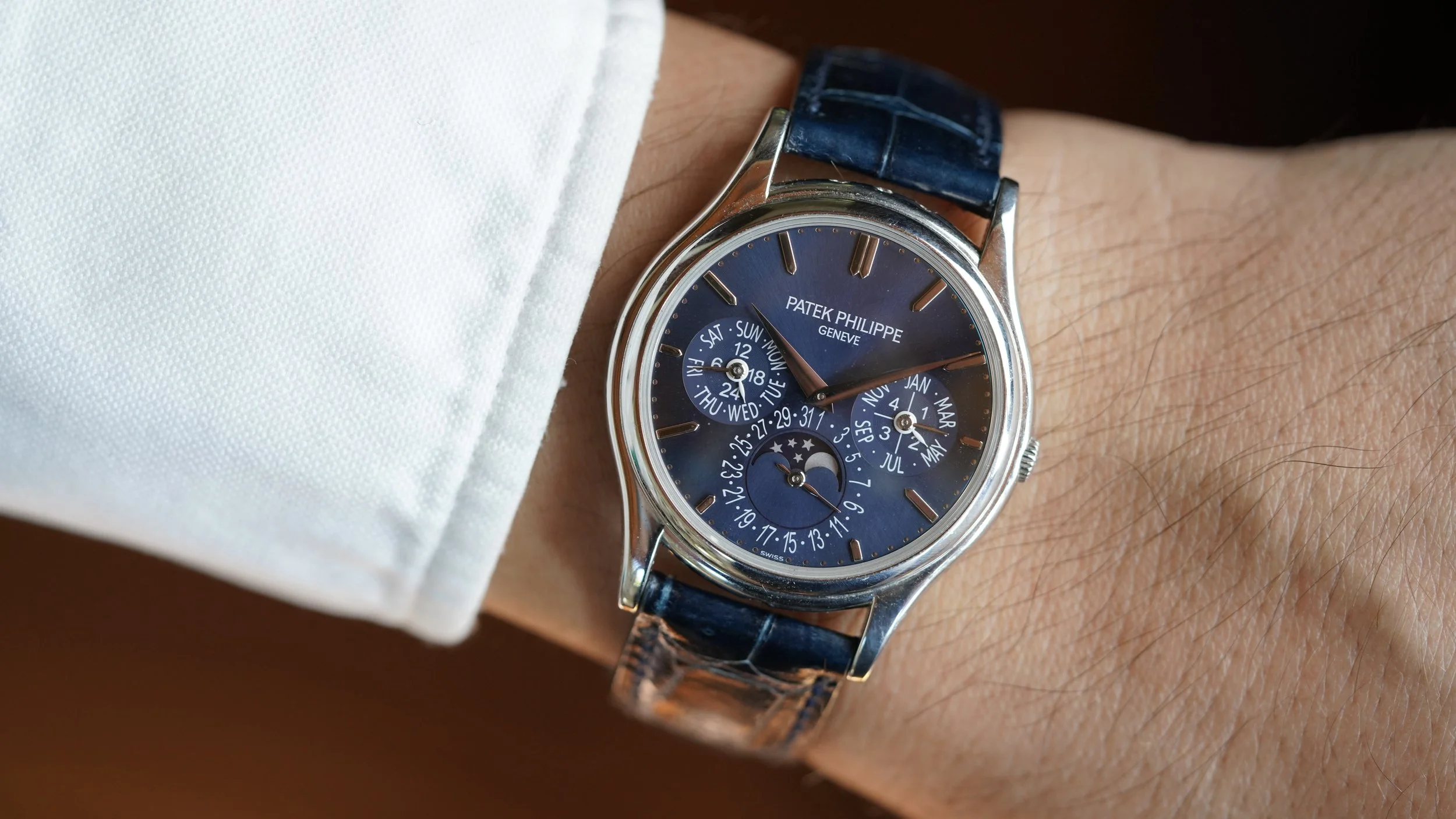 The Patek Philippe reference 5140 is one of the most beautiful complicated watches. This example is in platinum with a tremendous blue dial. It measures 37mm in diameter. The case appears to be unpolished. The watch dates to the 2010s. We do not know the date of production. It is powered by the calibre 240 Q.