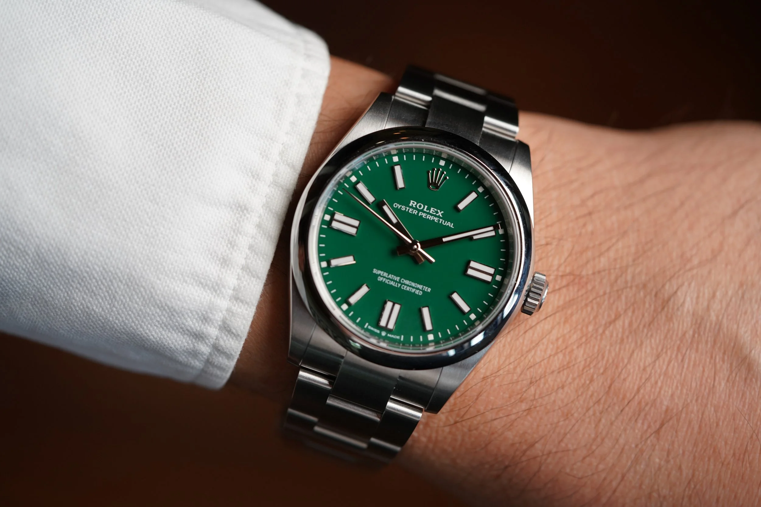 The Rolex Oyster Perpetual reference 134300 is an awesome modern watch. It features a great green dial. People absolutely love it and were losing their minds over it when it was released. It has great proportions at 41mm in diameter. The smooth bezel gives it a slightly more dressy look. The case is in phenomenal condition and unpolished. It is new.