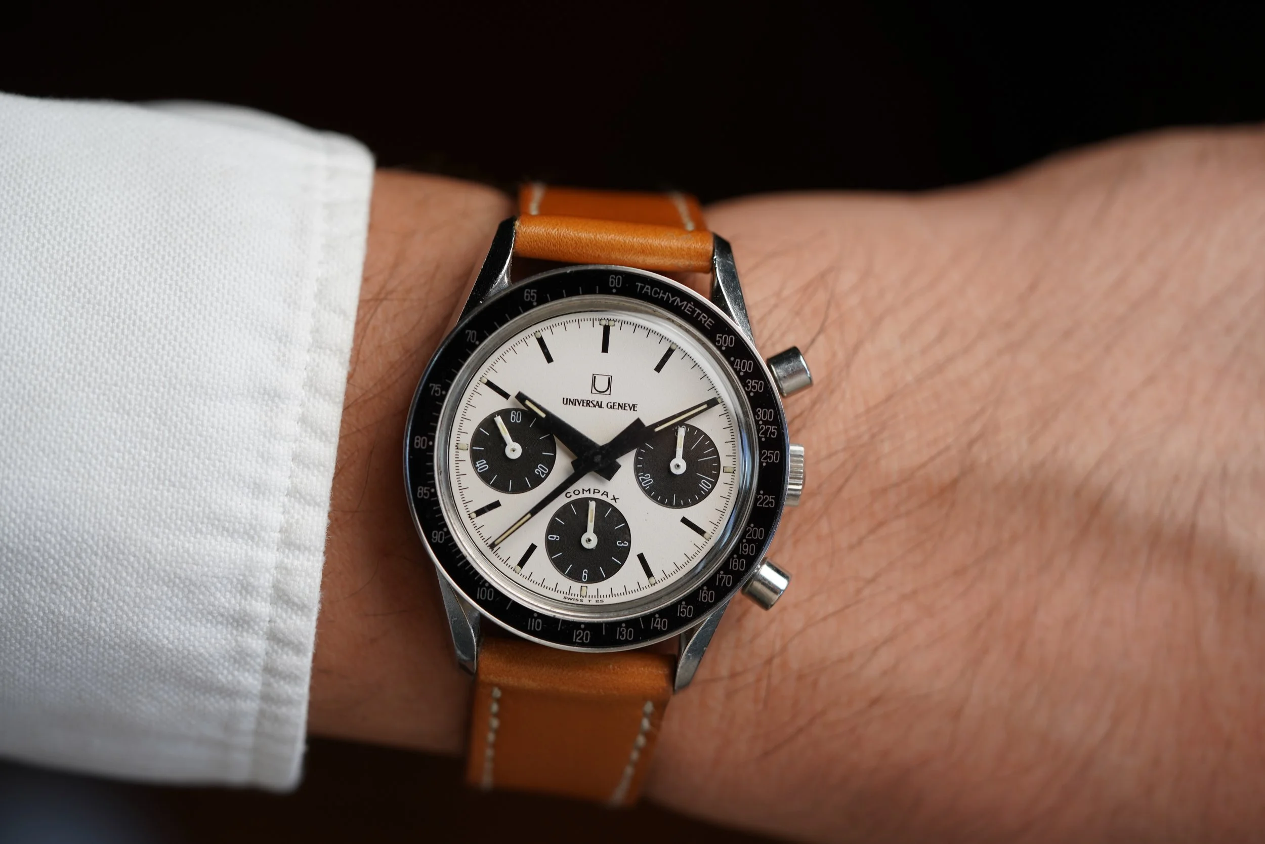 After a near 35 year horological hiatus, Universal Geneva finally made its long awaited return to watchmaking this month, April 2026. With all the attention surrounding the brand, it's hard to ignore the iconic Compax. This is a Universal Geneve Compax reference 885103/01. It features a Nina Rindt dial which could possibly belong to a reference 885103/02. It is possible that dial was put in this case. The watch case appears to be unpolished.