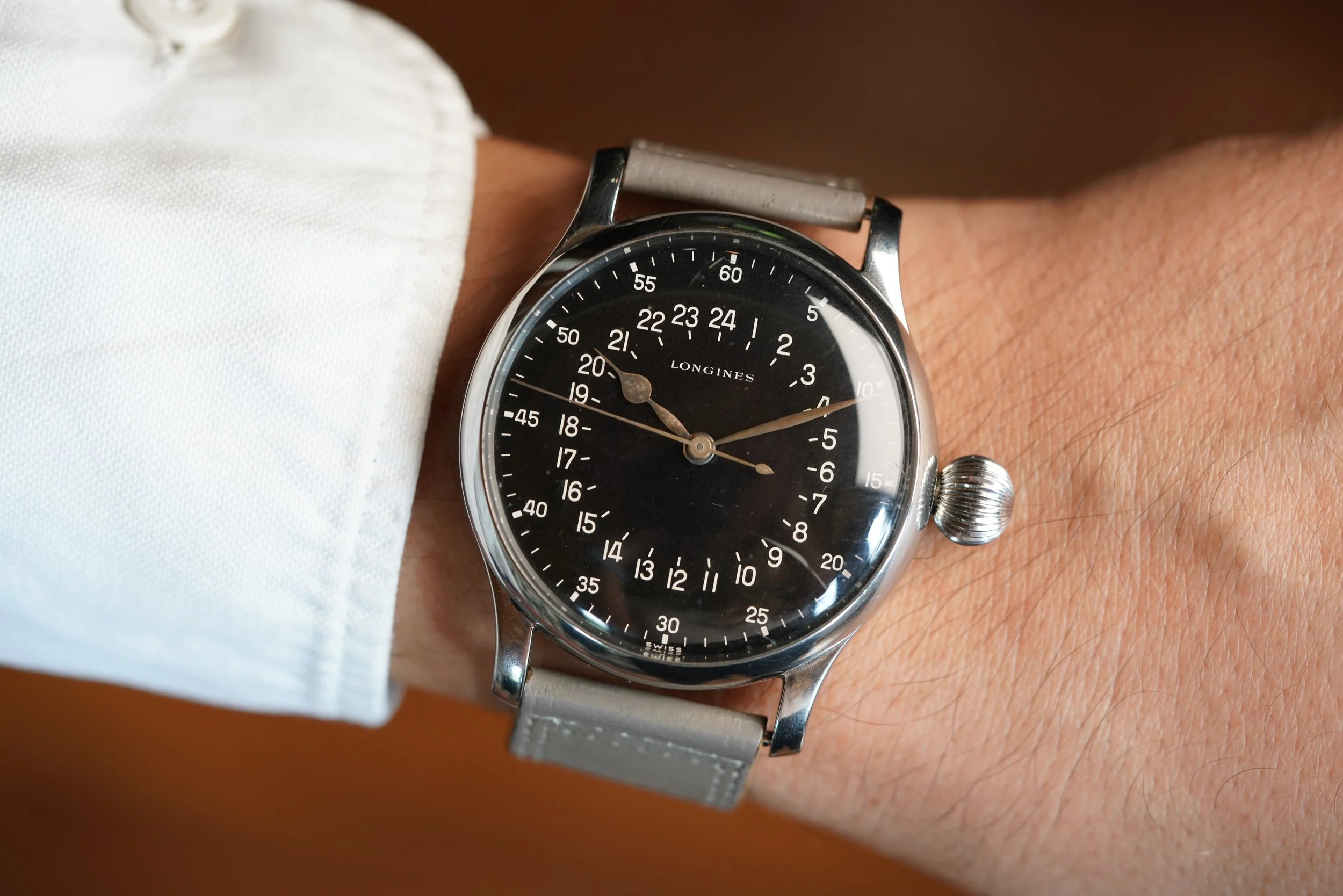 This Longines is an incredibly interesitng and rare oversized wristwatch made for Swissair pilots. The stainless steel case is a massive 47mm in diameter and 57mm lug-to-lug. The watch displays a 24-hour dial. It features a spade hour hand and leaf minute hand. The watch features a 9mm onion crown. The watch was invoiced to Swissair in 1957. These watches have sold as high as $176,000 at auction. For those looking for incredible aviation Longines timepieces, these are special watches.