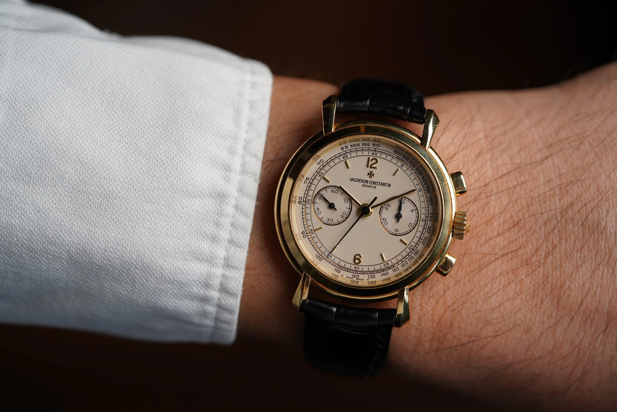 This Vacheron Constantin Historiques Chronograph reference 47101/4 is a fantastic and modern chronograph. These are among the most interesting and well made VC chronographs. The case is made of 18K yellow gold. The case appears to be unpolished. It measures 35mm in diameter and approximately 45mm lug-to-lug.
