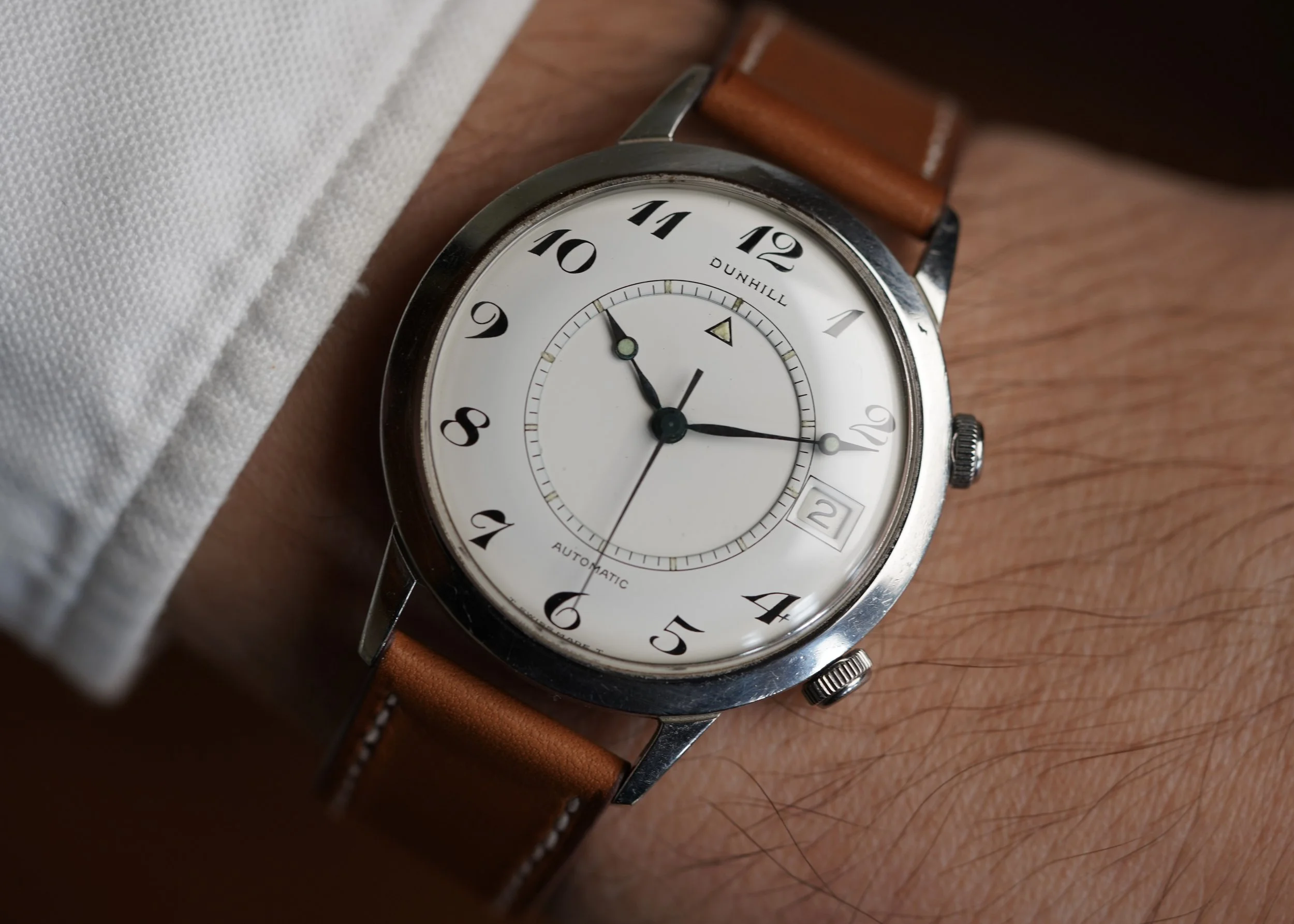 It has a manual-wind movement (Caliber 72 made by Valjoux), and measures 36mm in diameter, and approximately 45mm lug-to-lug.