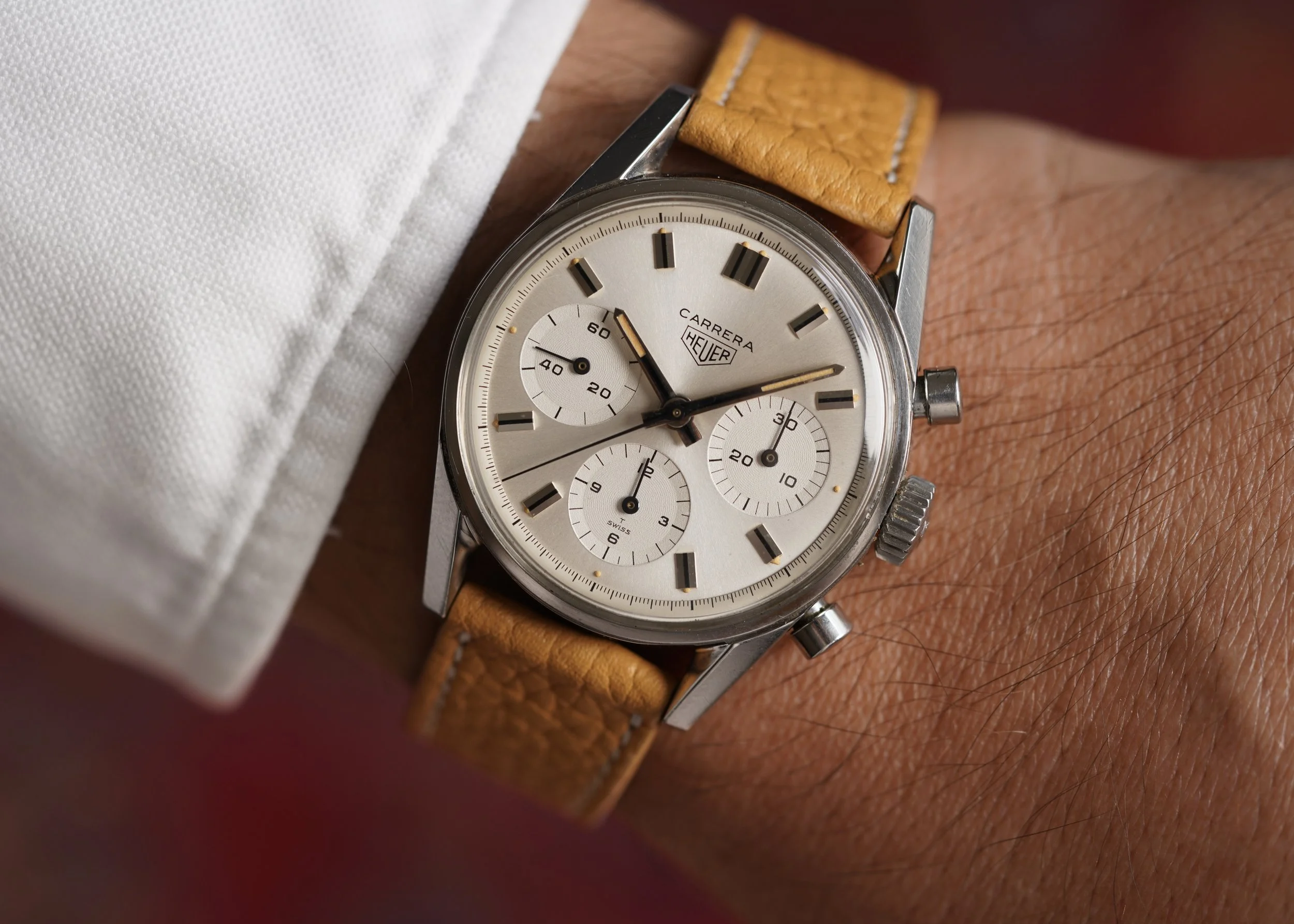 This Heuer Carrera reference 2447S is a very great example with a 2nd execution dial. The case appears to be unpolished. The watch is powered by the Valjoux calibre 72. It has a 92,2XX serial number dating to circa 1966-1967. The dial and hands have outstanding lume which is super attractive with this strap. I love this Carrera and am excited to see someone score an awesome Heuer.