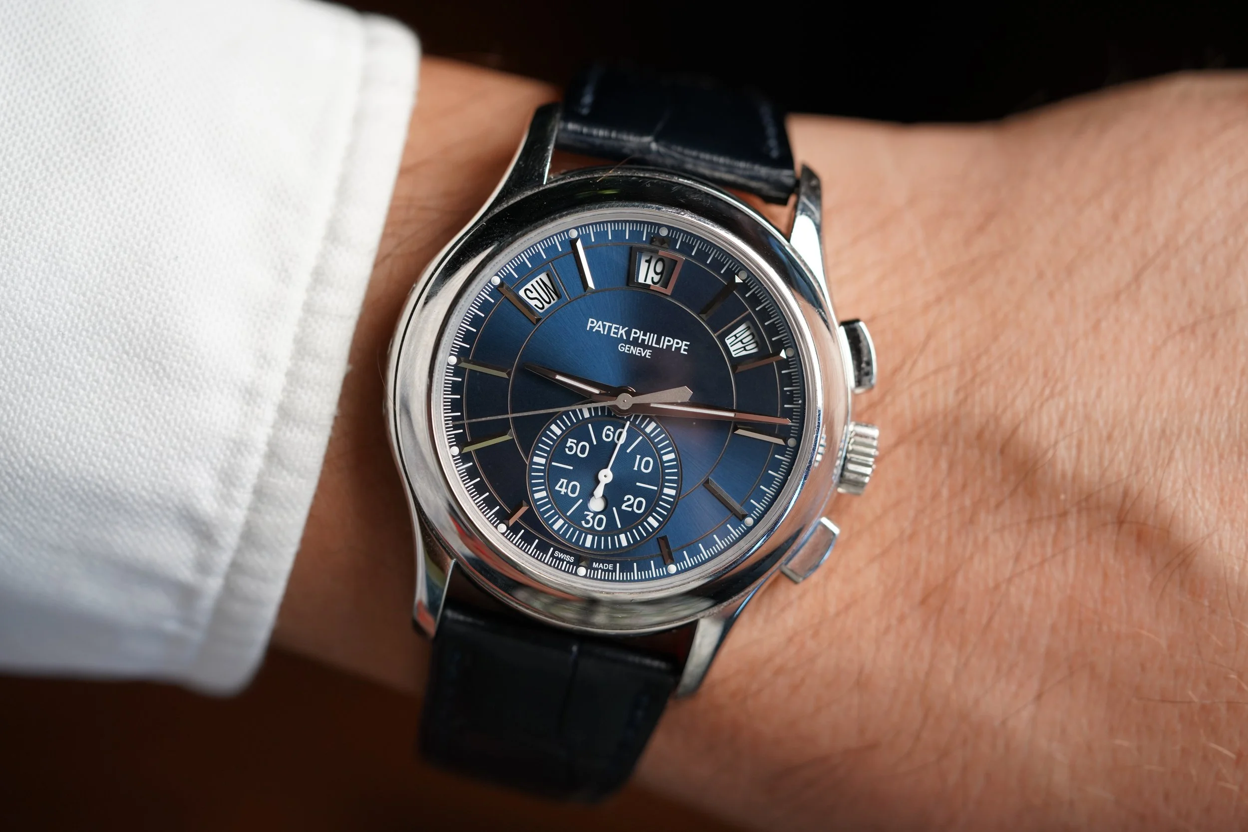 The Patek Philippe reference 5905P-001 is a very special self-winding annual calendar flyback chronograph. The platinum case measures 42mm in diameter. We believe the case is unpolished. It is paired on a beautiful Patek Philippe strap and platinum deployant. It has a stunning blue dial.