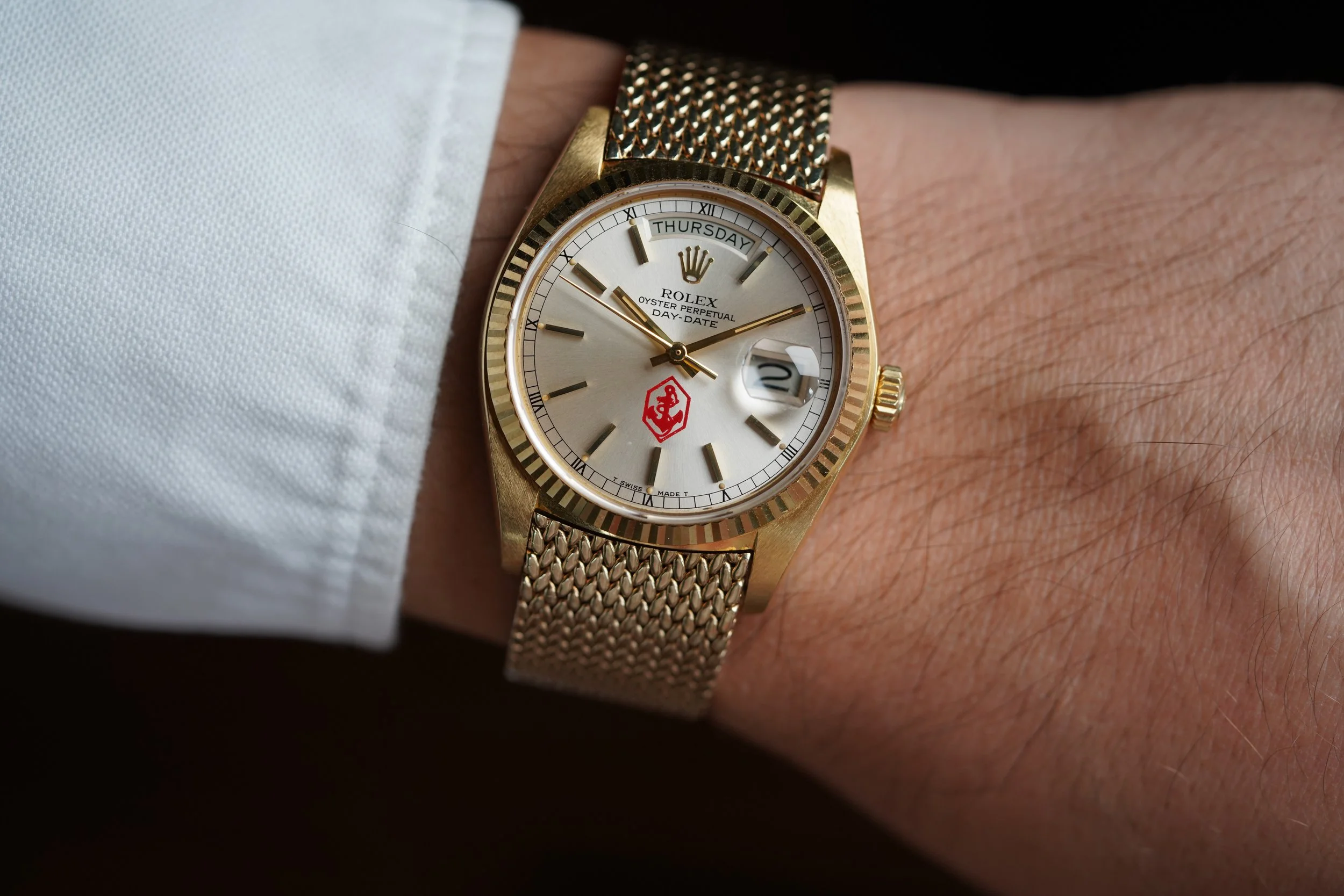 This Rolex Day-Date reference 18038 is an incredibly attractive watch with an unbelievably rare United States Merchant Marine dial. This particularly with this original non-Rolex gold bracelet makes for a seriously impressive watch. We would rather have this logo on our watch than the signature of a despot who allegedly committed patricide, honestly! These Merchant Marine Day-Dates are extremely rare and only a few are known. The 18K-gold case appears to be unpolished. It measures 36mm in diameter (43mm lug-to-lug). This particular example dates to circa 1978 with a 5.4M serial.