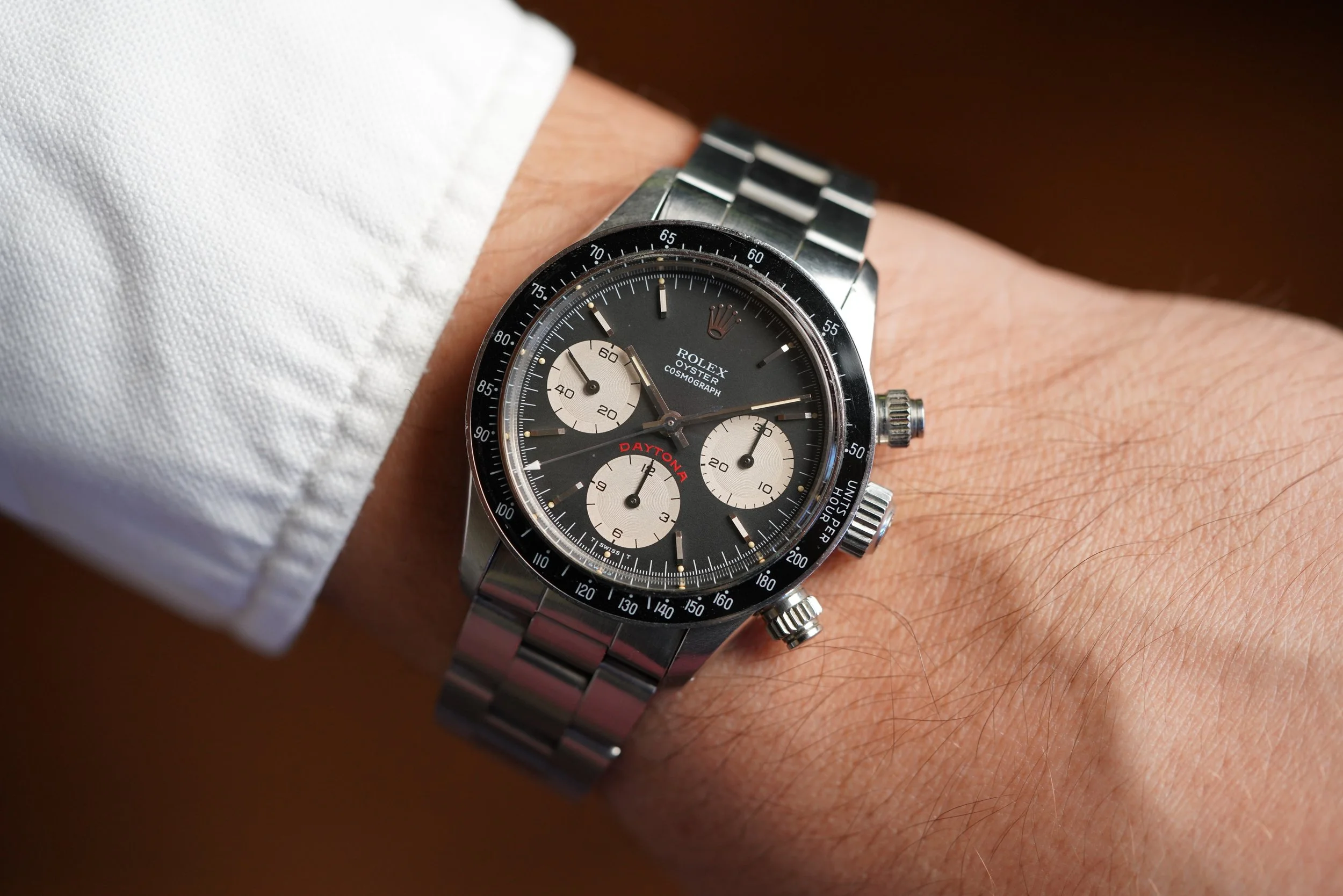 This Rolex Daytona reference 6263 is an incredible example with a very nice black “Big Red” dial. The dial is spectacular and the lume plots are fully intact, which is rare for vintage Daytonas. The hands and dial have a nice warm lume. The registers are a nice cream color.