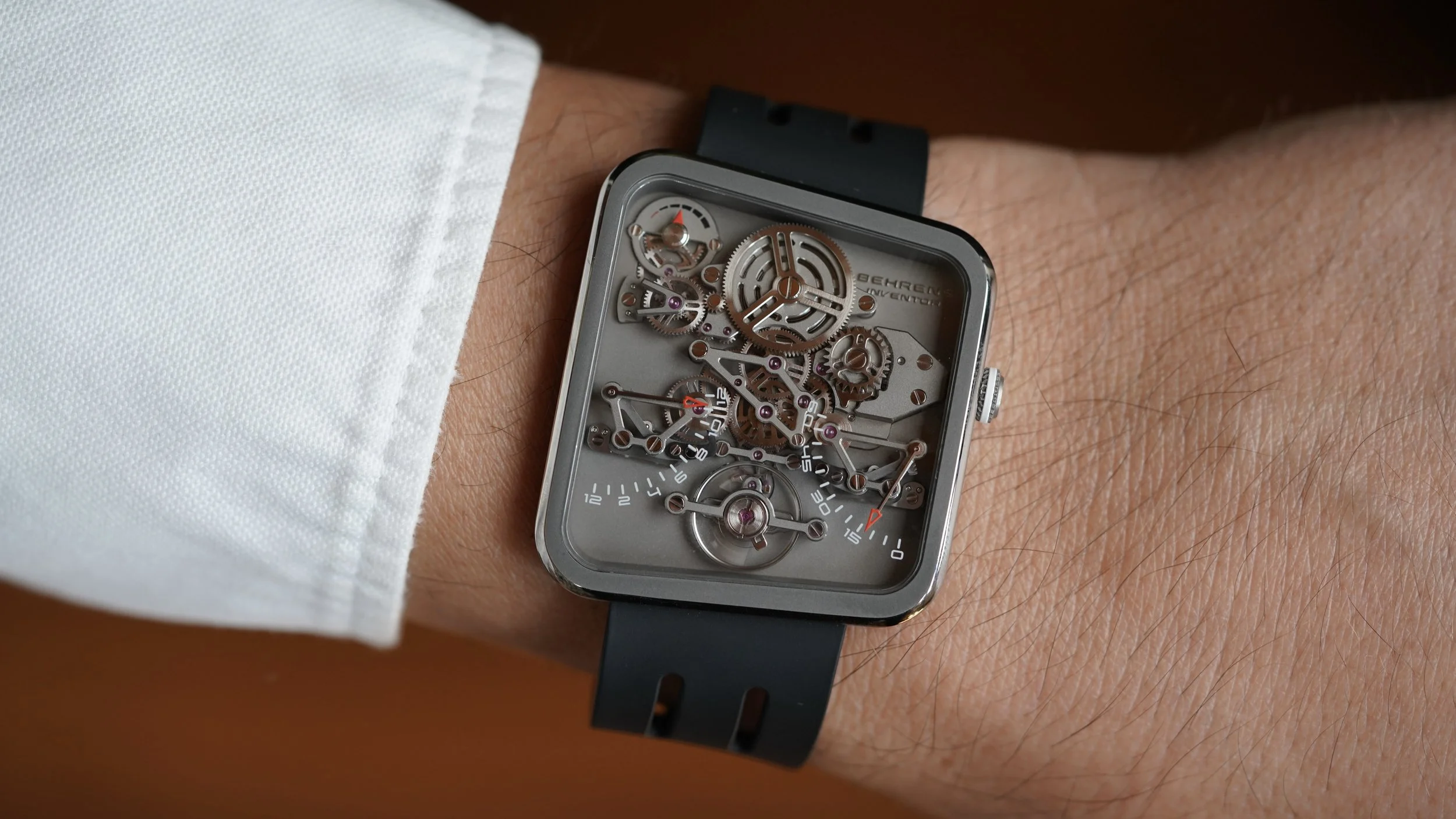 This Behrens Inventor reference BHR030 is an ultra light 20g watch with an openworked dial and power reserve. The oblique style case measures roughly 38 x 42.5mm and is made of titanium. The watch features a sapphire crystal and BM02 base movement. It comes with an integrated rubber strap and titanium pin buckle. It is in like new condition with the original caseback sticker.