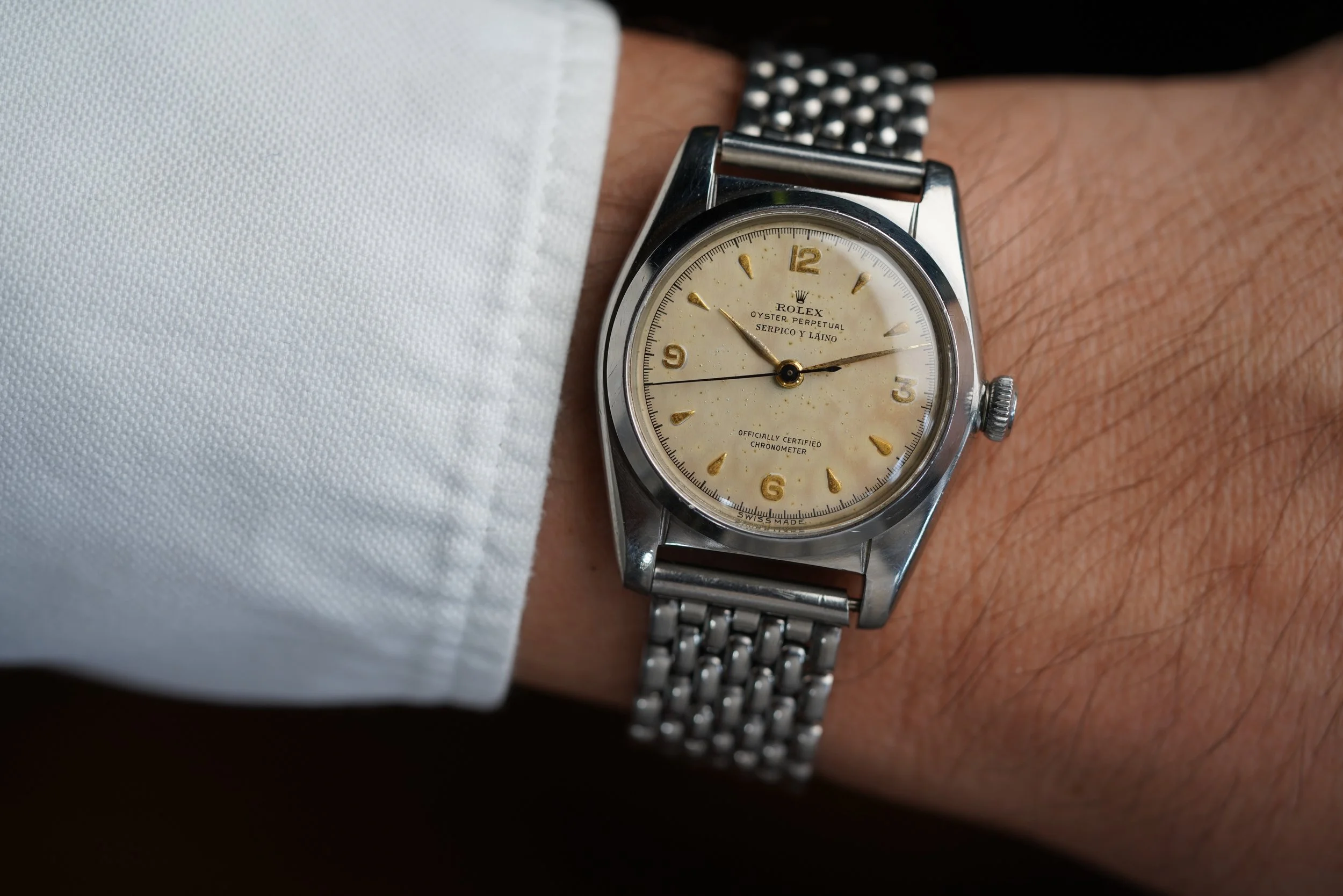 This Rolex Oyster Perpetual “Bubbleback” reference 5050 is an incredible watch with a non-luminous dial retailed by Serpico Y Laino. Serpico Y Laino is one of the most prestigious names in double-signed dials. It is the Venezuelan retailer known for selling some of the most incredible Rolex and Patek Philippe wristwatches in the 20th century. The watch dates to the late 1940s. The case measures 32mm in diameter by 39mm lug to lug. The dial has developed a beautiful warm tone. It is paired on a beads of rive bracelet made by Gay Frères dating to 1951. It will fit a wrist approximately 7 inches. The case is possibly unpolished.