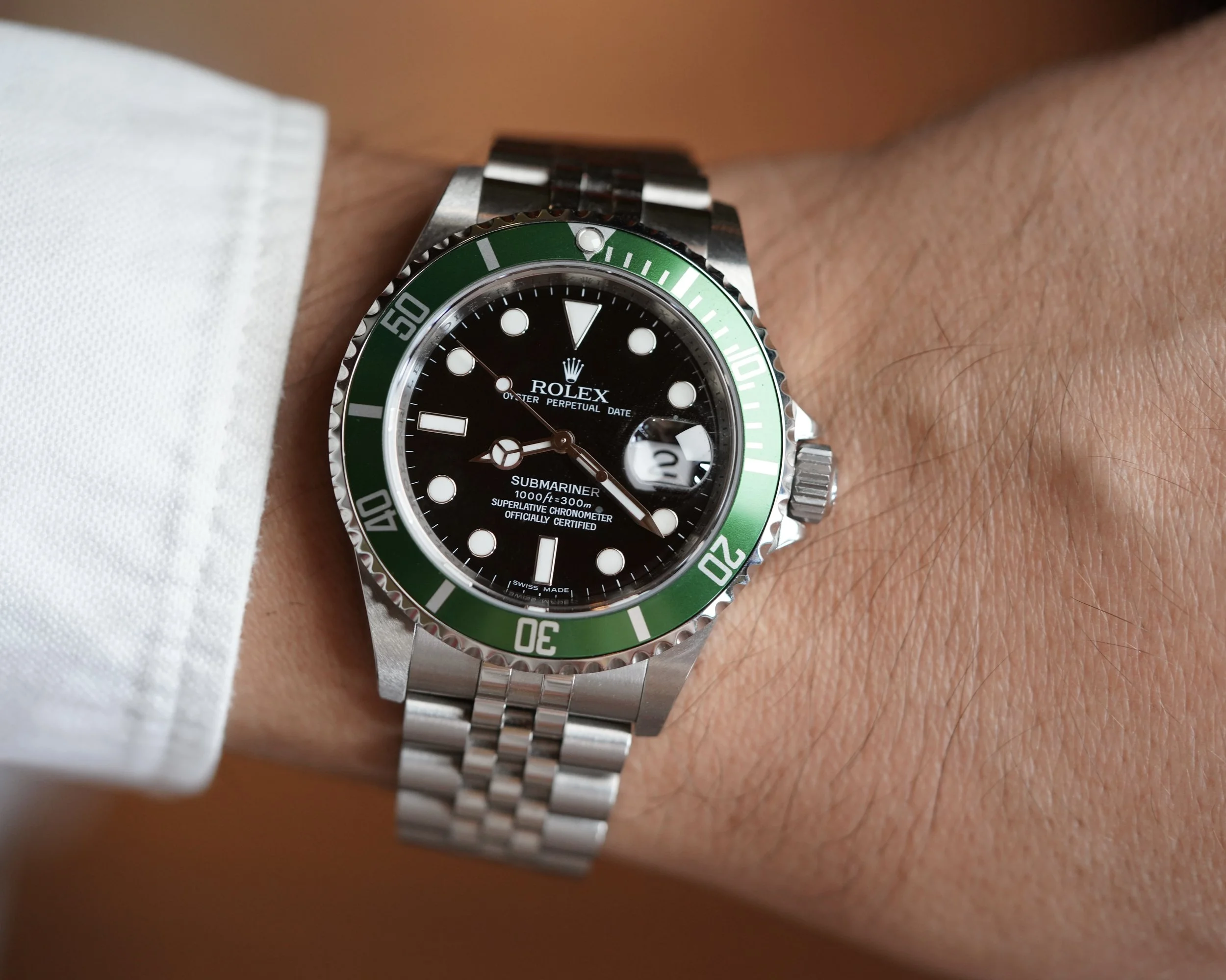 The Rolex Submariner is one of the most renowned sports watches of all time. This 16610LV features an M serial number and is paired with a “super” Jubilee bracelet with hidden clasp. This reference features a green bezel, a black dial and a date window at the 3 o'clock position. The watch is in incredible condition and appears to be unpolished. The watch comes with an additional oyster bracelet that is fully stickered.