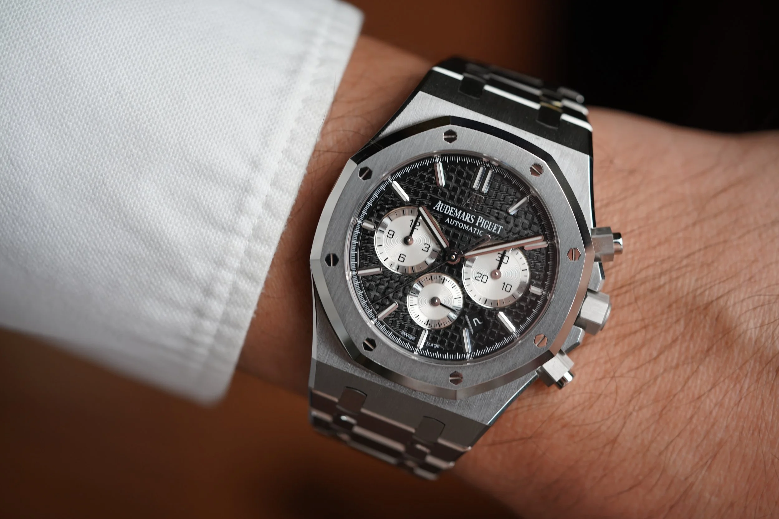 The Audemars Piguet Royal Oak reference 26331ST.OO.1220ST.02 is one of the epic Royal Oak chronograph models. The watch measures 41mm in diameter and has a stainless steel case and bracelet. It will fit a wrist slightly above 7 inches. This example features a black “Grande Tapisserie" dial with silver subregisters.