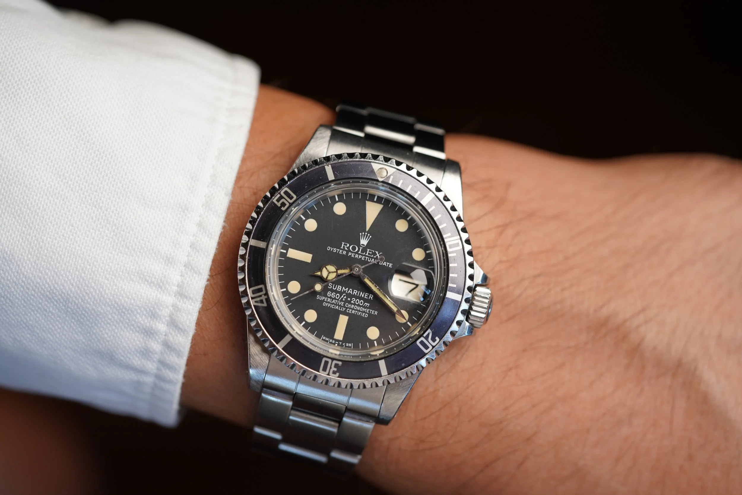 It is a “Maxi” Sea-Dweller dial and was among the last examples of the legendary reference 1655 made. These examples with 6 million serial numbers have the extremely large hour markers that give them the “Maxi” moniker. I find them to be the most beautiful Great White Sea-Dweller dials. The reference 1655 models with all-white text are known as “Great White” models and the early examples are known as “Double Red” Sea-Dwellers with two red lines of text and the earliest, essentially prototype and not-for-sale, Sea-Dwellers are known as “Single Red” Sea-Dwellers with a single line of red text.