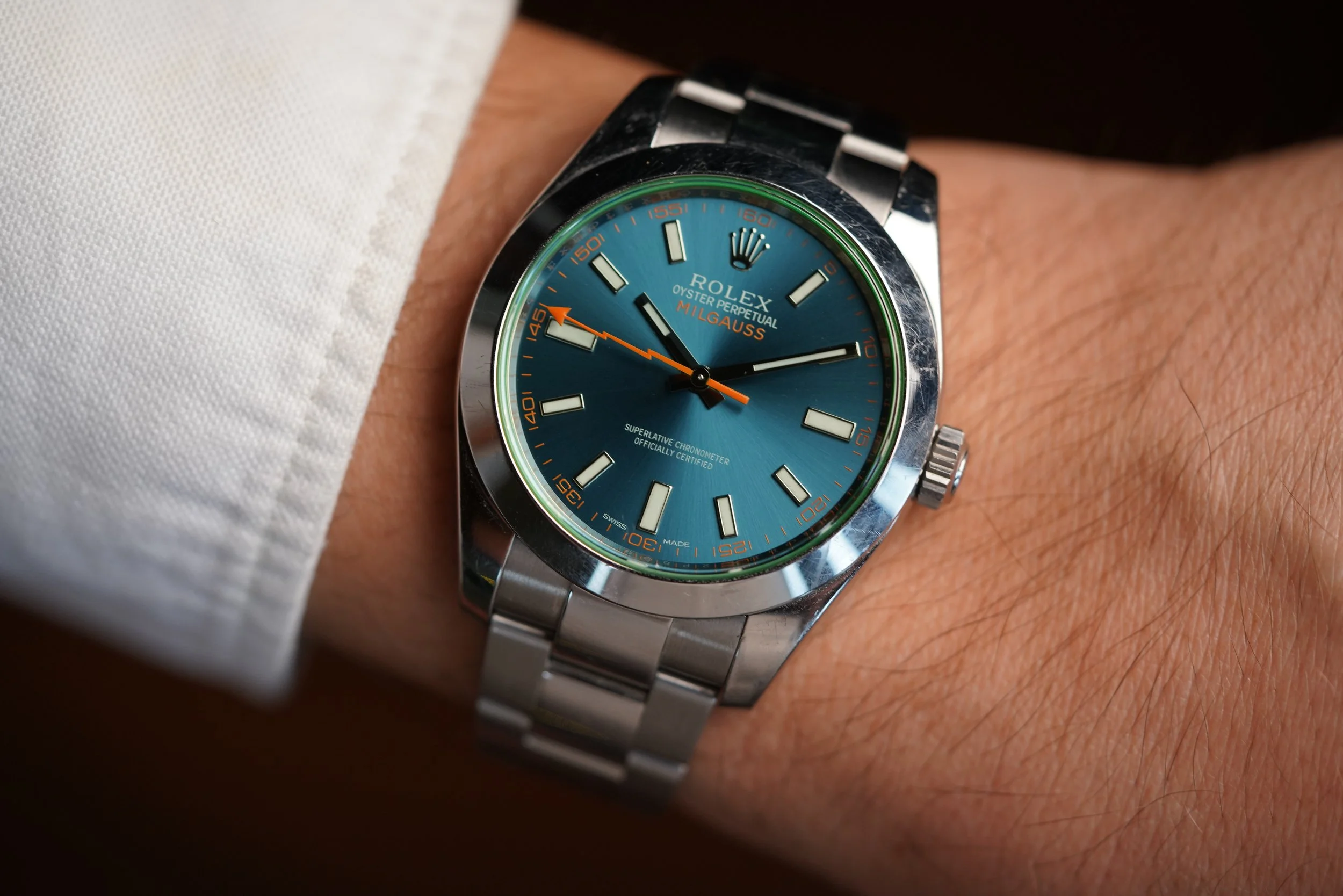 This Rolex Milgauss reference 116400 features the blue dial with orange accents and thunderbolt hand. It is the model which features the green crystal. The case appears to be unpolished.