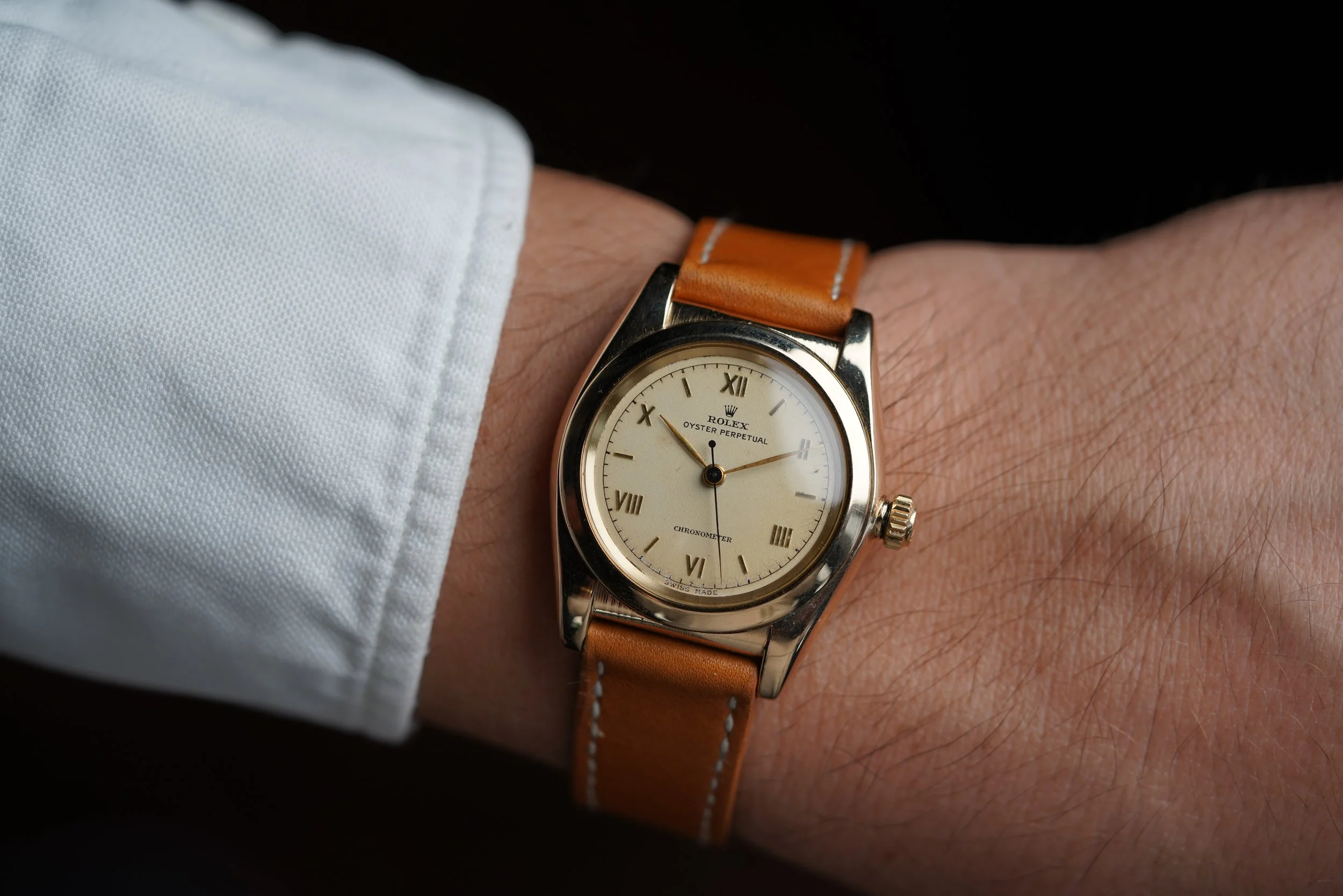 This Rolex Oyster Perpetual “Bubbleback” reference 3131 is a fascinating and early waterproof Rolex model. This example dates to circa 1946 with a 418,XXX serial. The case is made of 14k yellow gold. It has been lightly polished but is in nice condition. The dial remains unrestored which was common for many of these Bubblebacks during their peak of collecting throughout the 80s and 90s. The dial features beautiful Roman numerals and is a non-luminous variant. The crown is a later replaced Oyster crown..