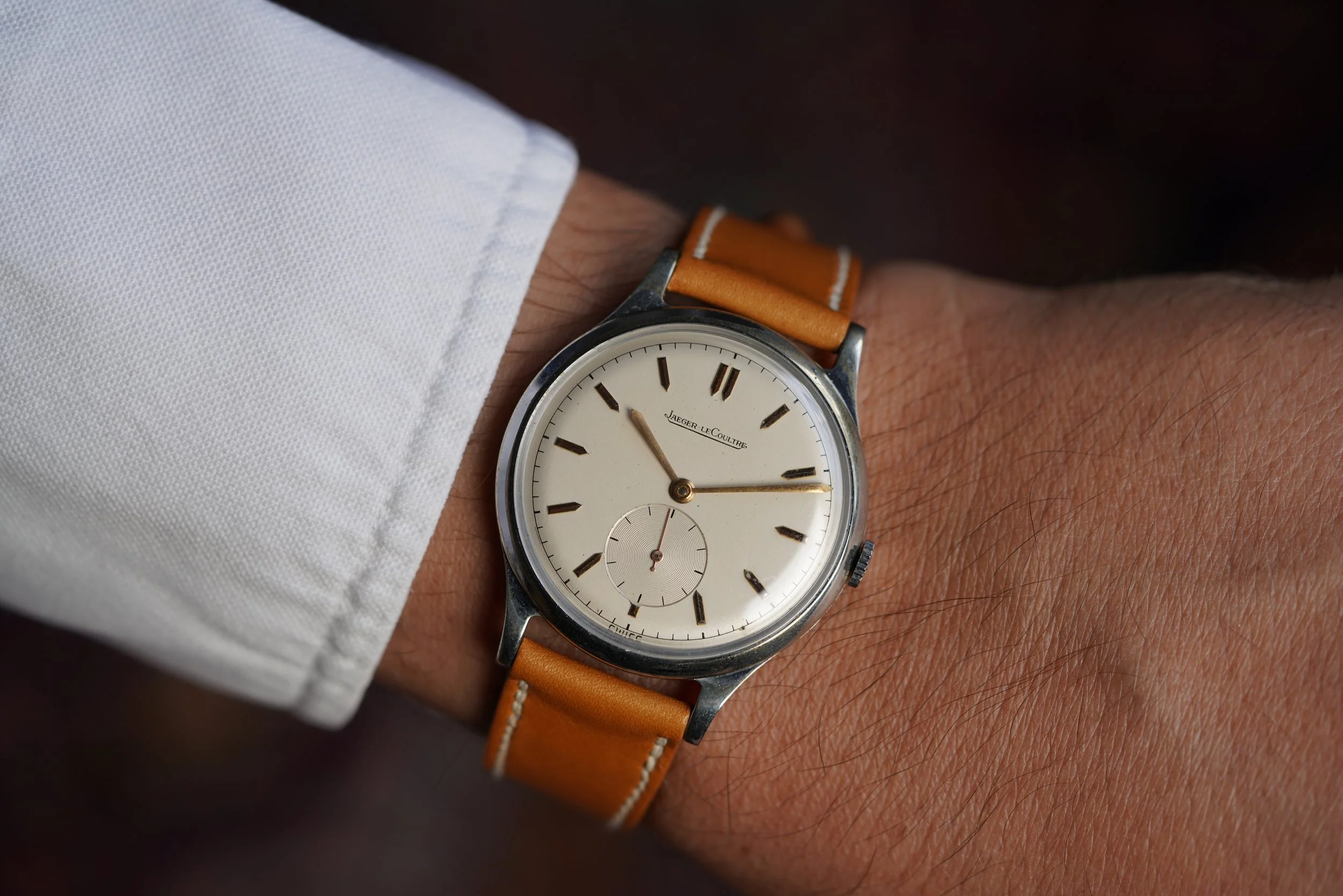 We’re thrilled to offer an extremely attractive time-only Jaeger-LeCoultre reference 2982B from the early 1950s. The dial features very attractive dauphine markers similar to those seen on the Patek Philippe 2526. The watch is powered by the manual-wind Calibre P469/A.