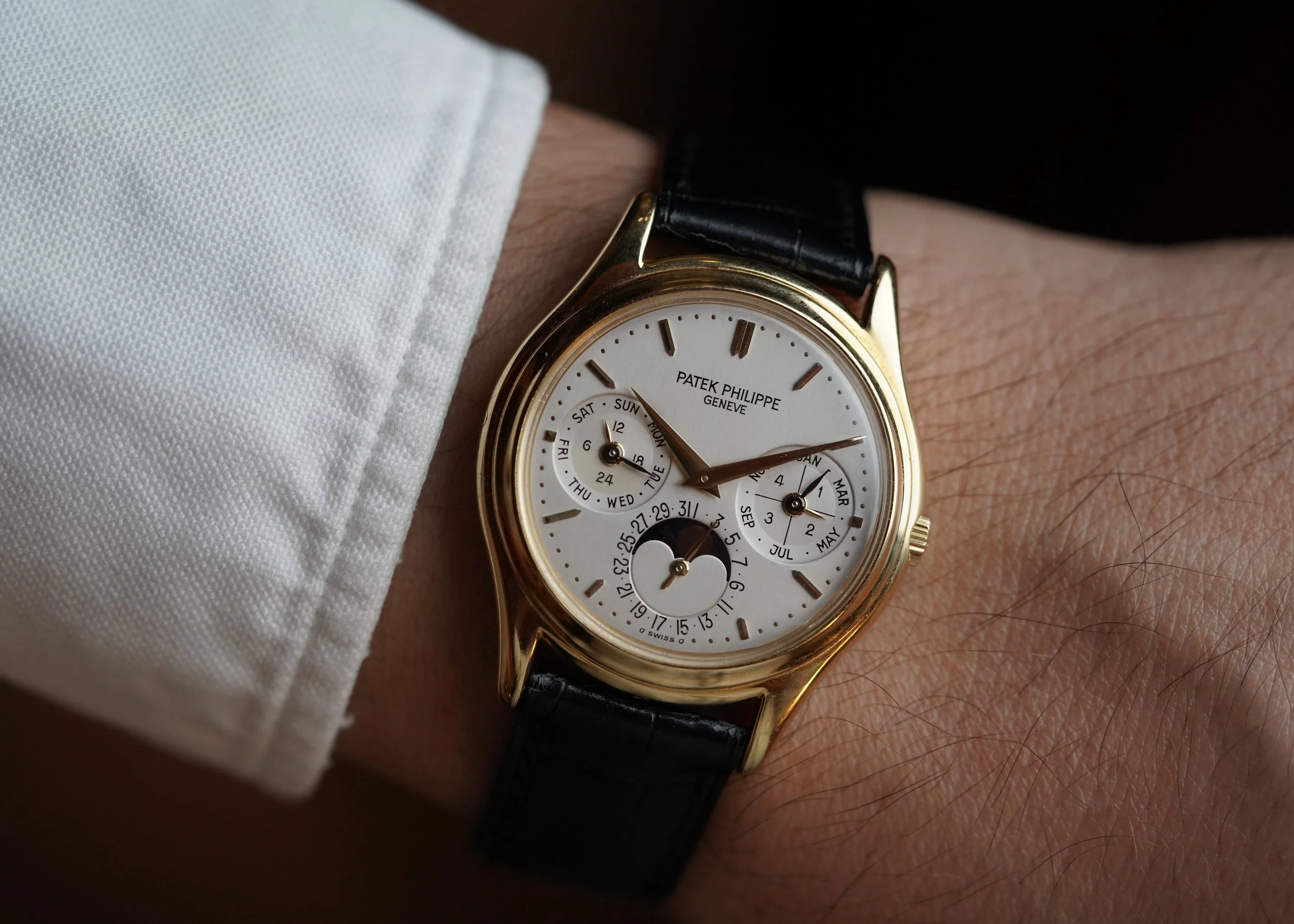 The Patek Philippe reference 3940 perpetual calendar is one of the most important and elegant complicated timepieces one can find from any manufacturer. This particular example is in yellow gold featuring the early 2nd series dial. The calendar/dial is in English. It is in fantastic condition. The bottom half of the 24-hour register has a beautiful slightly-beige hue from 6:00 PM to 6:00 AM. This watch features the iconic self-winding microrotor calibre 240Q.