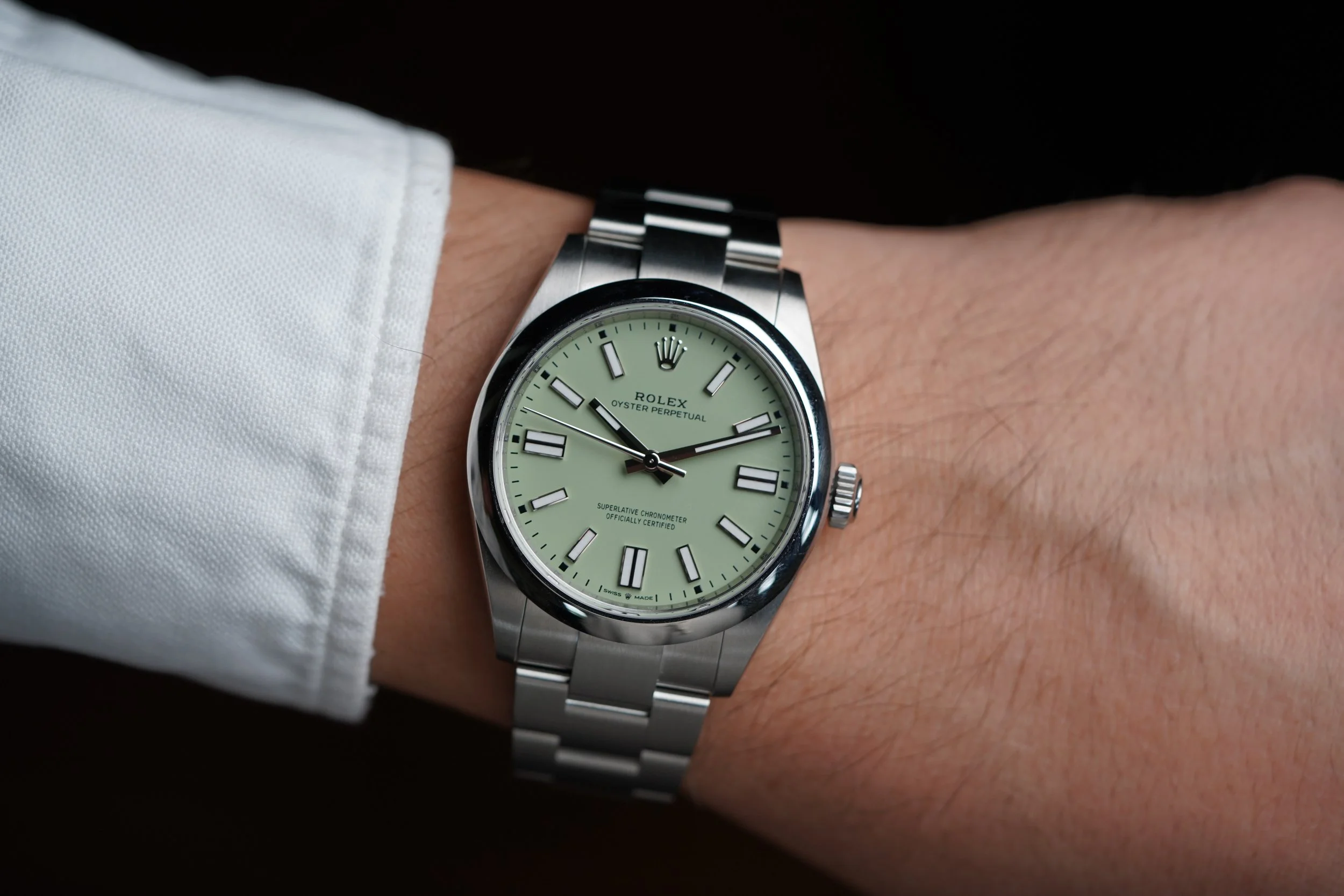 The Rolex Oyster Perpetual reference 134300 is an awesome modern watch. Nicknamed “The Pistachio” - this dial is incredible and one of the most exciting 2025 releases from Rolex! People absolutely love it and are losing their minds over it! It has great proportions at 41mm in diameter. The smooth bezel gives it a slightly more dressy look. The case is in phenomenal condition and unpolished. It is brand new.