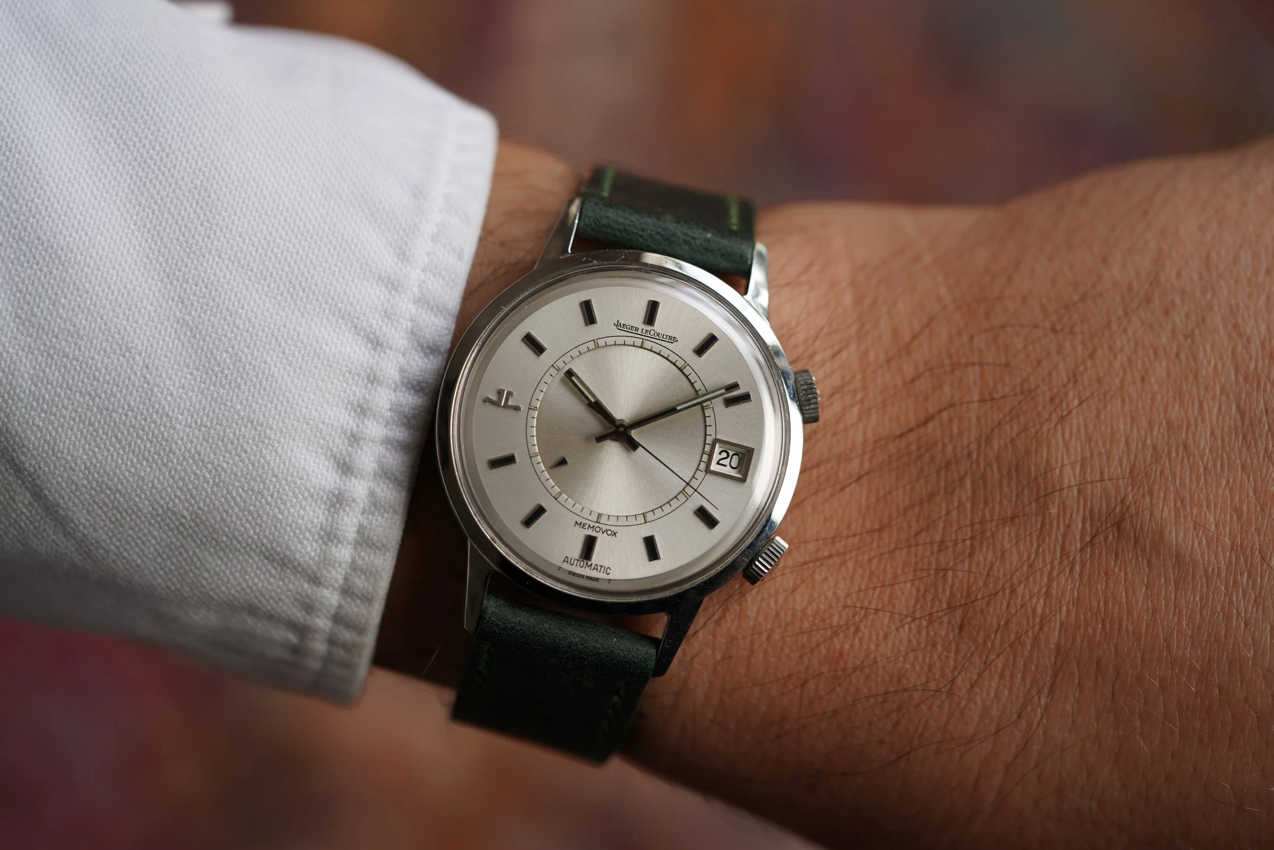 The Jaeger-LeCoultre Memovox reference E 875 is one of my favorite Memovox references. The cases are really great with fantastic proportions at 37mm in diameter (45.5mm lug-to-lug). This particular example has a very clean and beautiful dial. The case has been lightly polished, but is strong. It features a high-beat calibre 916 and the alarm sounds spectacular. For those with an appreciation for alarm watches great choice and one of my favorite recommendations to Jaeger-LeCoultre enthusiasts.