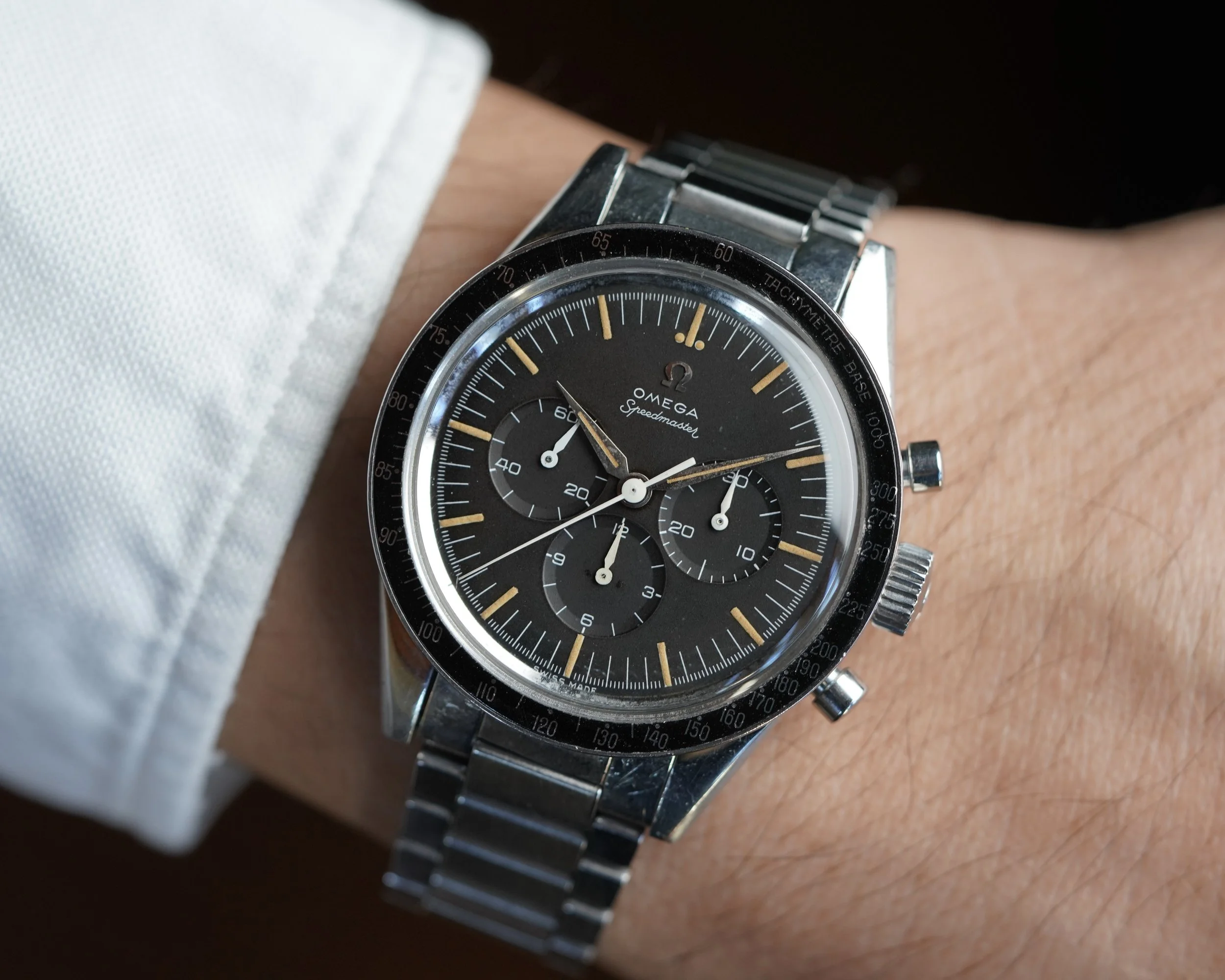 The OMEGA Speedmaster is one of the most iconic watches with a truly rich history of exploration and sport. This an out of this world example Speemaster reference 2998-1. It features a gorgeous dial that is turning a bit dark brown. The lume is outstanding and rich. It measures 39.5mm in diameter. The case appears to be unpolished. The original black “Base 1000” aluminum bezel is in phenomenal condition. It features the original Naiad crown.