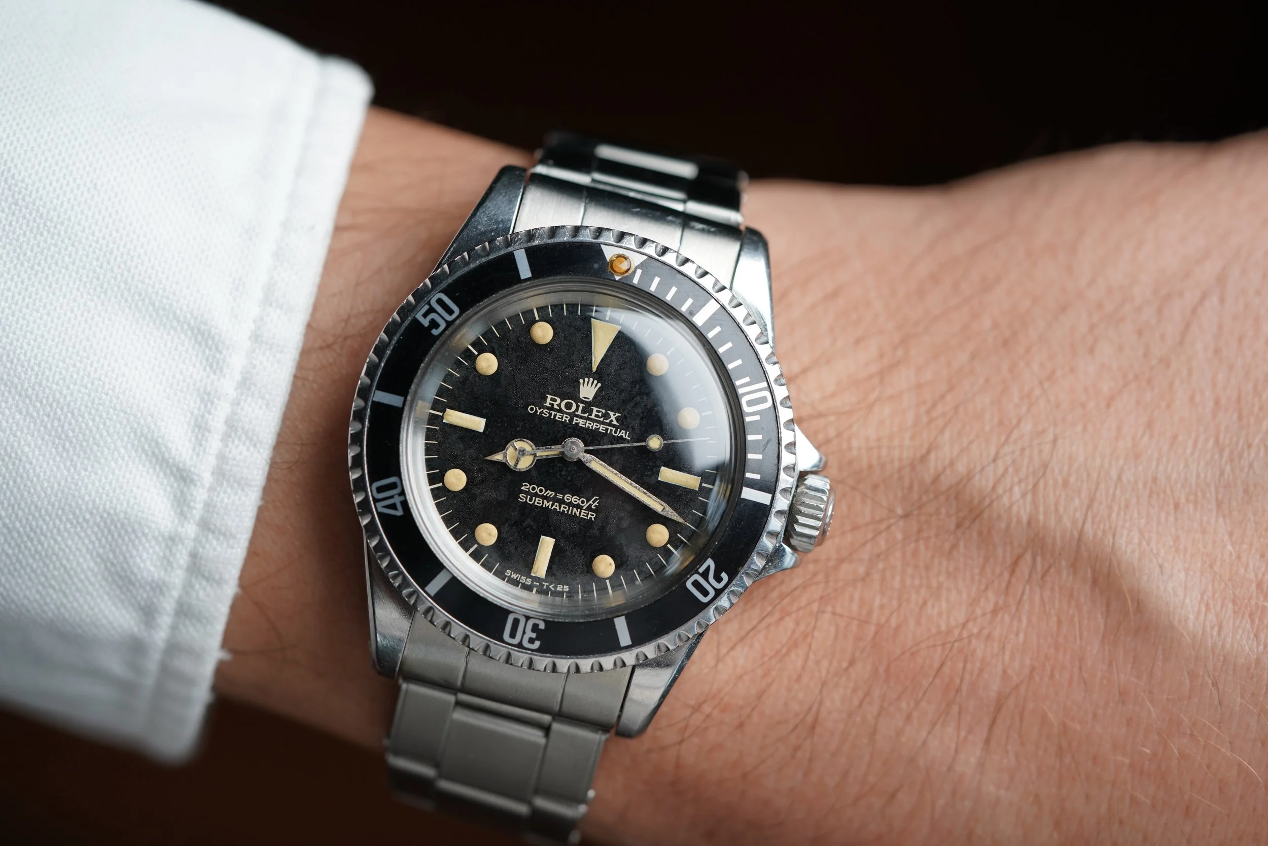 This model features a tropical gilt underline dial. The watch features a 1.04M serial and dates to circa 1964. The case is 36mm in diameter. It has been polished in the past. It is paired on a later folded link Rolex bracelet dating to 1971. This watch also features 280 end-links, which are typically associated with Submariners.