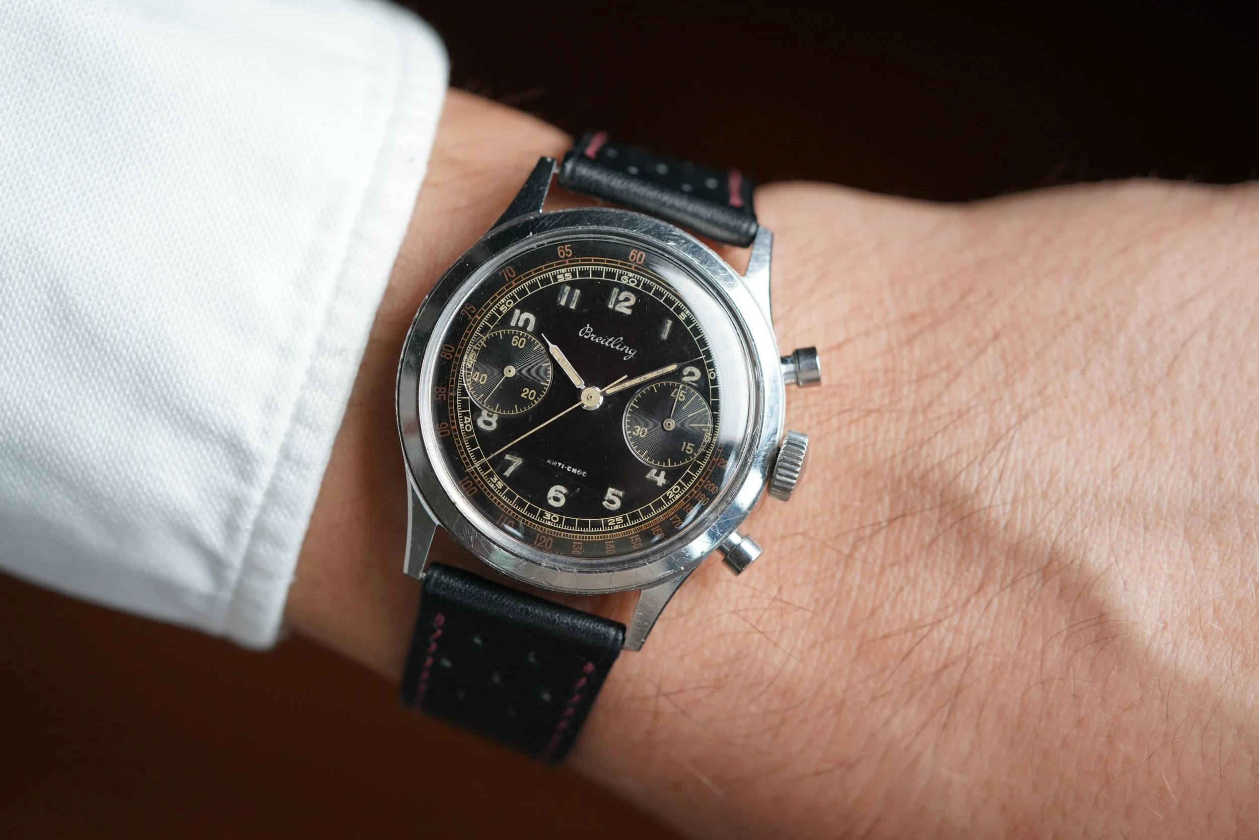 This Breitling chronograph reference 777 is an awesome example with an unpolished steel case. The gilt glossy dial is very attractive with a gold-colored minutes/seconds track and a copper-colored outer tachymeter track. The serial number places it into the circa late 1943 to early 1944 range. The KOS import code on the movement signifies that it was imported by Paul Buhre to the United States, which makes sense. The dial has an attractive and small “ANTI-CHOC” signature above 6:00 for the anti-shock capabilities of the Venus movement.