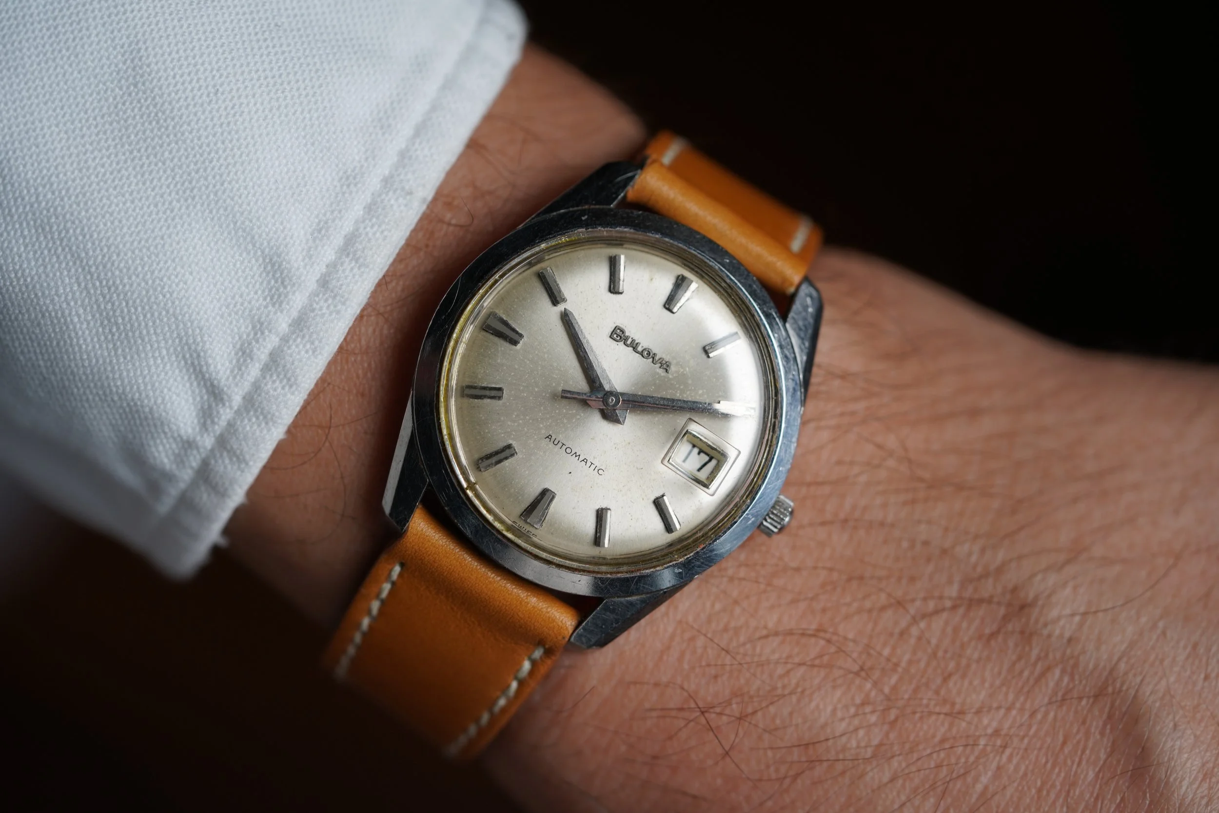 This is a very fun Bulova wristwatch. The stainless steel case measures 35mm in diameter. It features a very cool non-luminous dial. The case is unpolished.