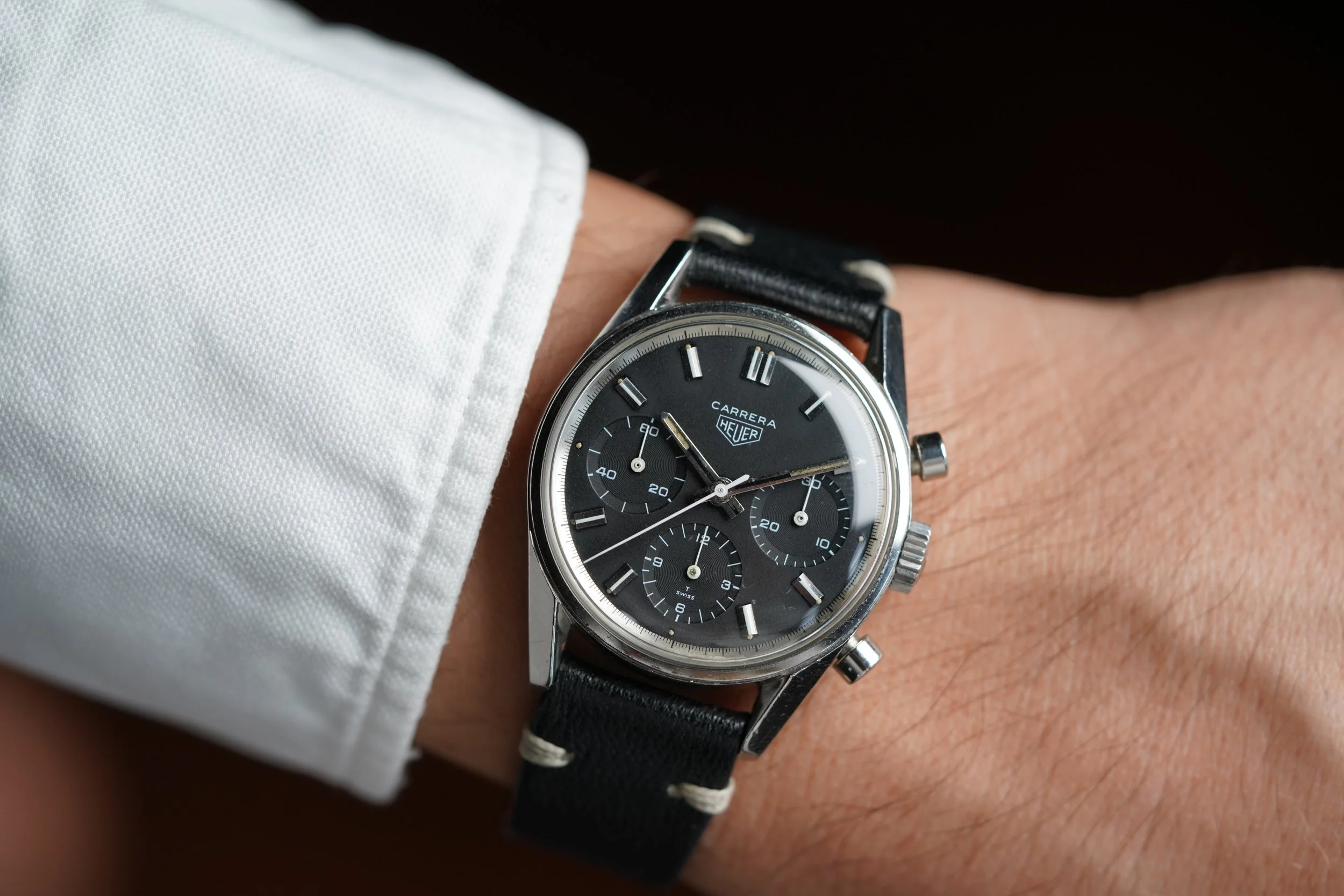 The only time better than now to buy a vintage Heuer was back in the 1960s! The Carrera is an iconic sports chronograph which is one of the most versatile watches to have in a collection. This is an attractive example with the black dial. It measures 36 millimeters in diameter and 45mm lug-to-lug. The watch is powered by the Valjoux manual-winding calibre 72. The case has been polished.