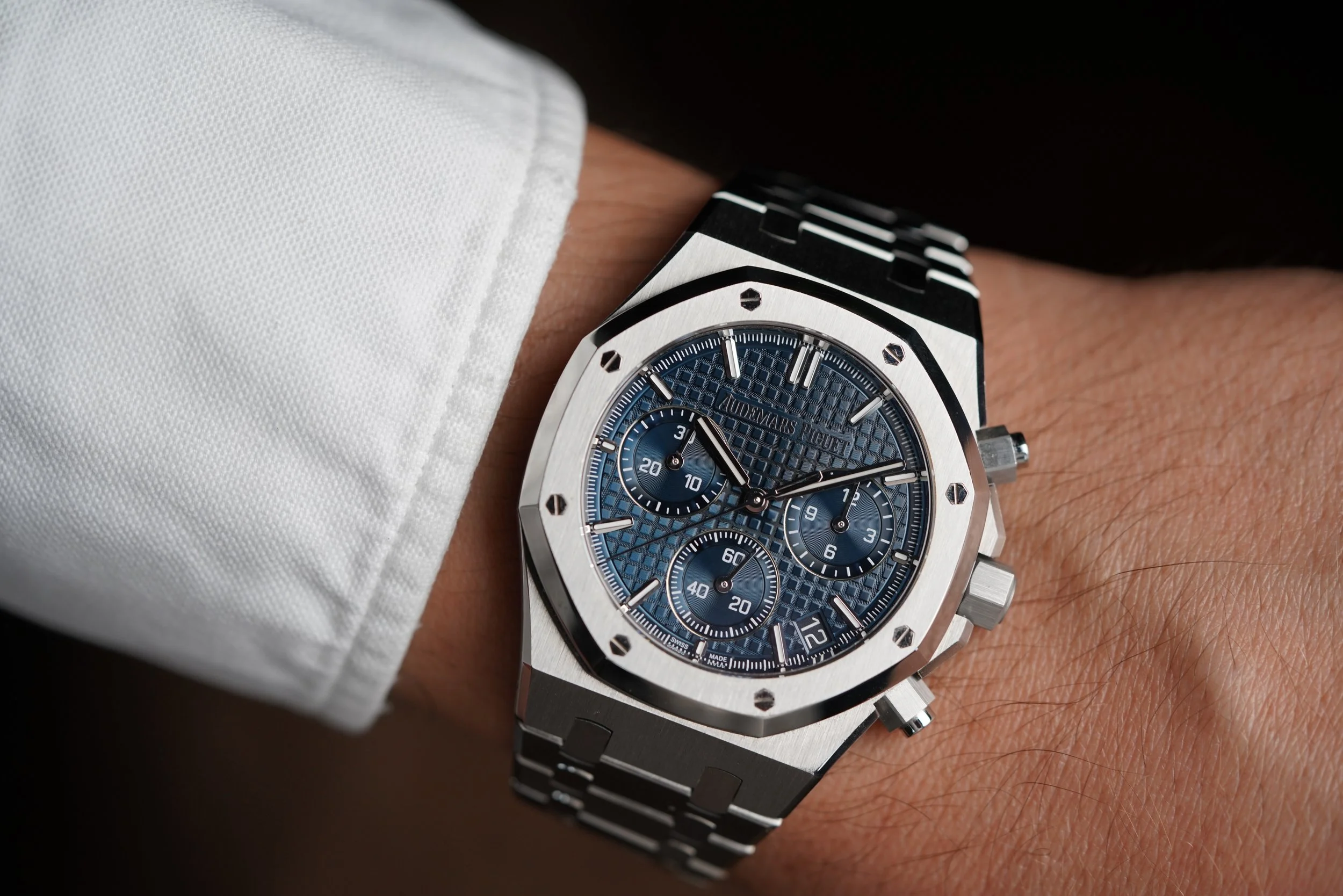 The Audemars Piguet Royal Oak is easily one of the most recognized watches on the market today. This particular model is the “50th Anniversary” reference 26240ST with a blue dial. It is a selfwinding chronograph with an exhibition caseback and 50th anniversary rotor. It measures 41mm in diameter. The case is unpolished and has a few scratches on the bracelet and case.