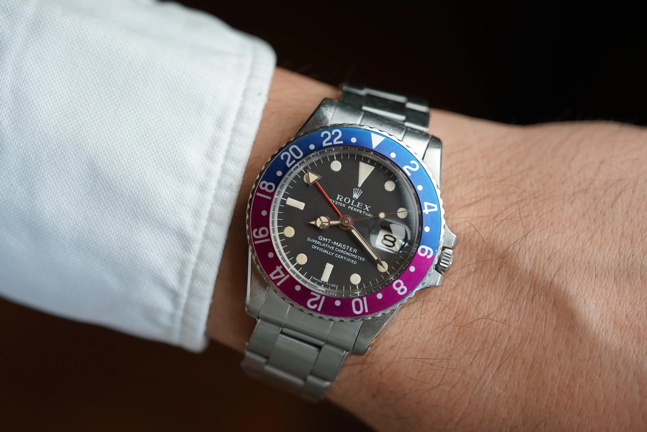 The Rolex GMT-Master was originally designed for Pan Am pilots in the 1950s and continues to be a flagship model for Rolex to this day. The reference 1675 was introduced in 1959 and remained in production until 1980.