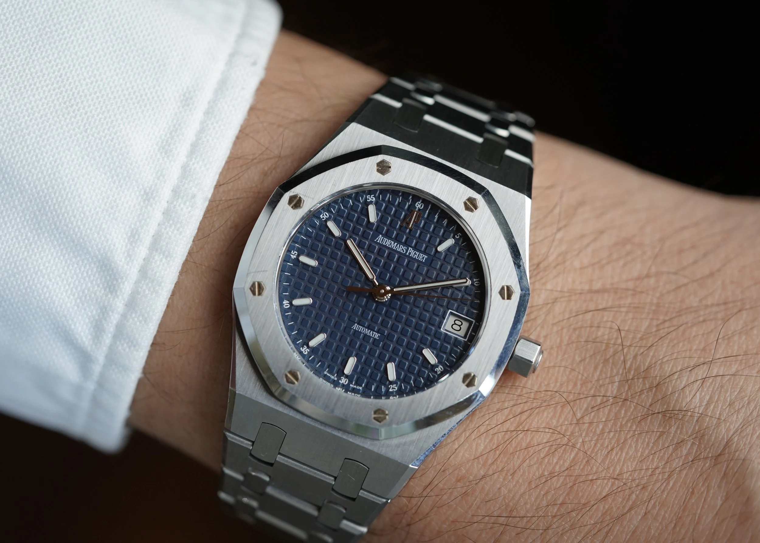 The Audemars Piguet Royal Oak is among the most iconic wristwatches. This example, a reference 14790ST, is a great compact Royal Oak. It measures 36mm in diameter, but wears larger as it has a lug to lug measurement of 46mm. The bracelet can fit a wrist of approximately 7.25 inches. The case is very attractive and appears to be unpolished.