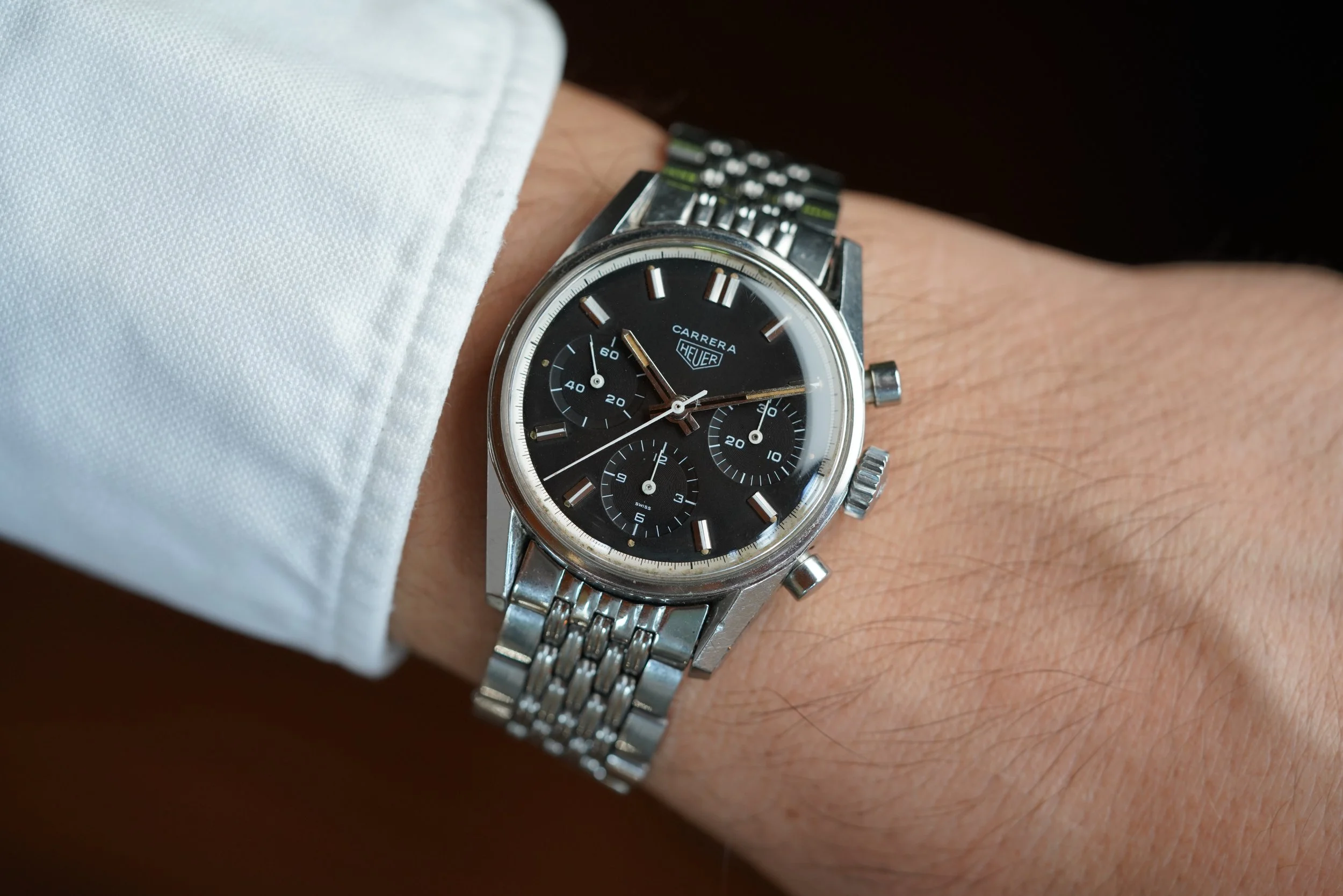 The only time better than now to buy a vintage Heuer was back in the 1960s! The Carrera is an iconic sports chronograph which is one of the most versatile watches to have in a collection. This is a very attractive example with the black dial. The case appears to be unpolished. It measures 36 millimeters in diameter and 45mm lug-to-lug. The watch is powered by the Valjoux manual-winding calibre 72. It is paired on a nice Gay Freres Bracelet dating to 1969. The watch dates to circa 1968-1969.