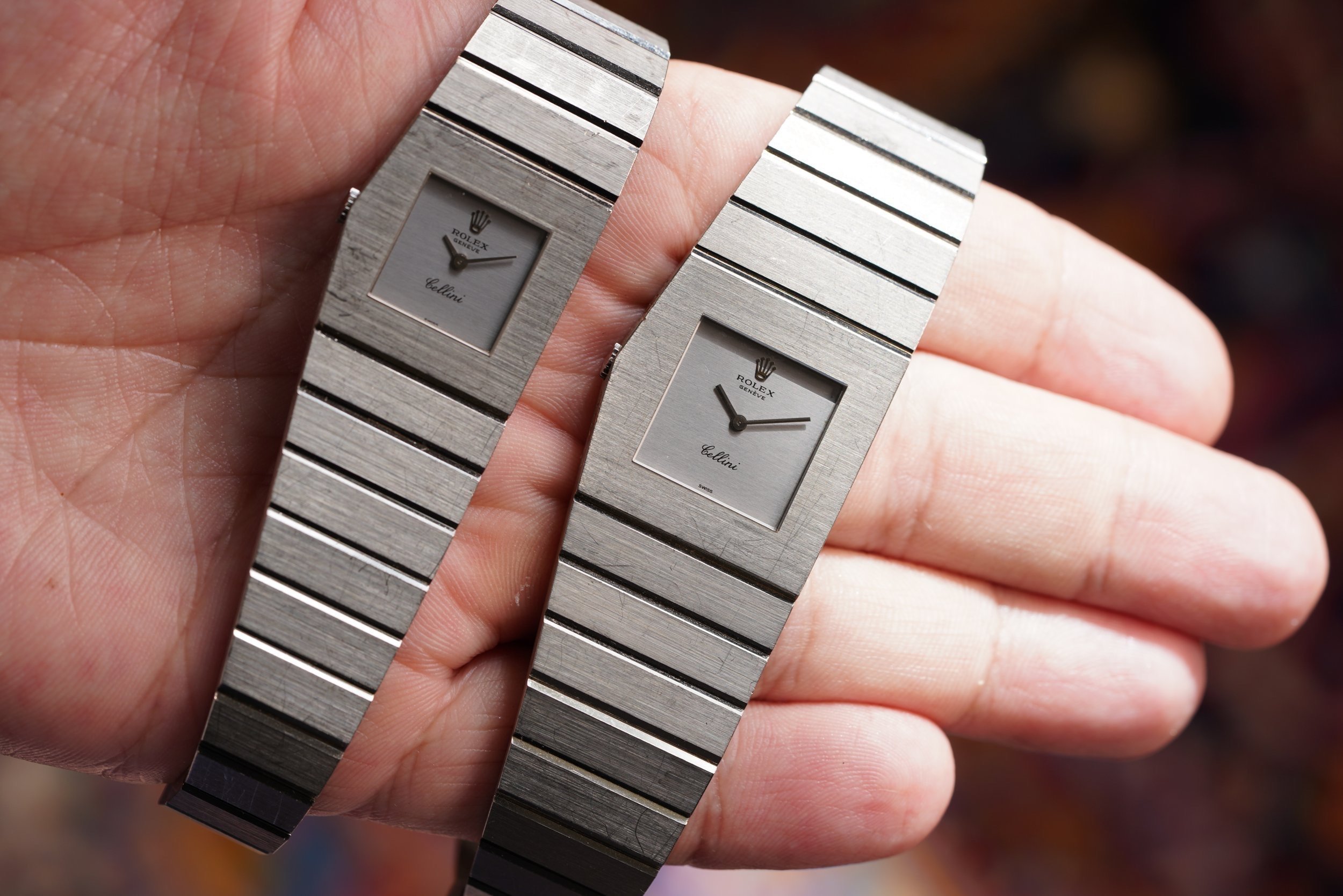 The watches are in fantastic condition and unpolished, with the original finish maintained on both timepieces. The integrated bracelets and deployant buckles are extremely firm.