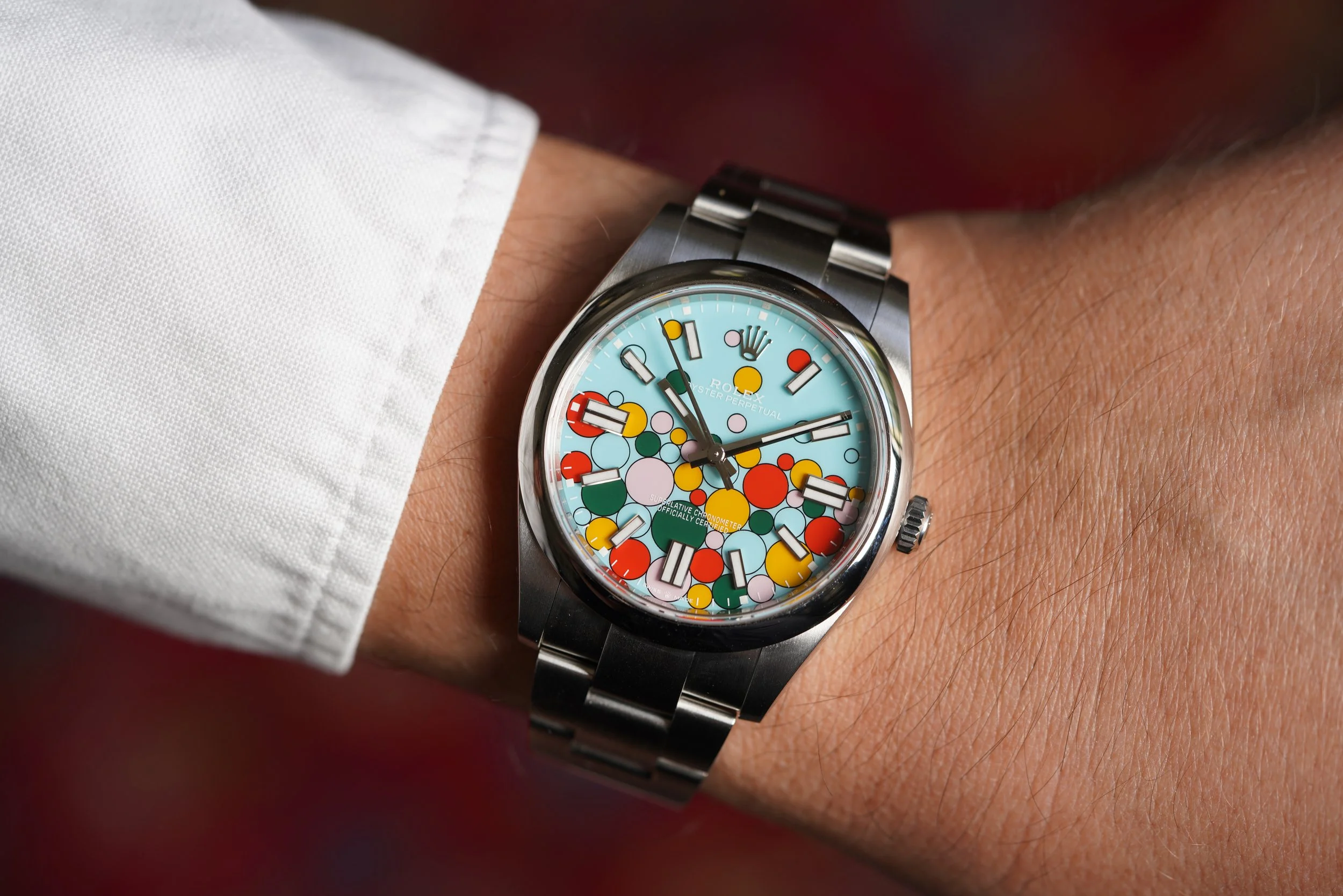 This Rolex Oyster Perpetual reference 124300 is a very special and interesting release from Rolex featuring the “Celebration” dial. These were a very exciting and unexpected design from the crown. The watch is unpolished and is in brand new condition and never worn. It is the best price on the market.